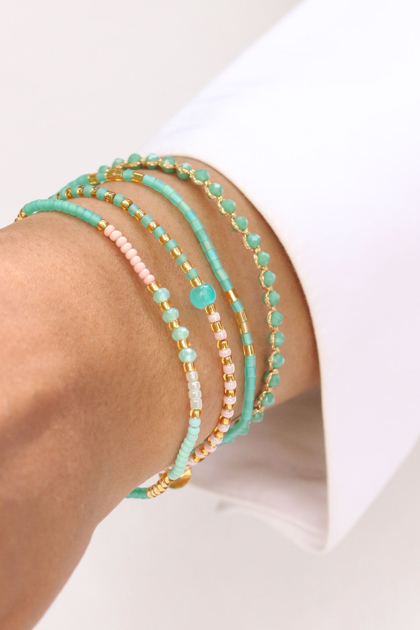 Two colors set the tone for our Livorno bracelet mix: ocean green and glossy ivory. The centerpiece of the Piazza series is a 4 mm glass bead in soft green. Alternating gold beads provide an elegant finish.