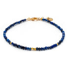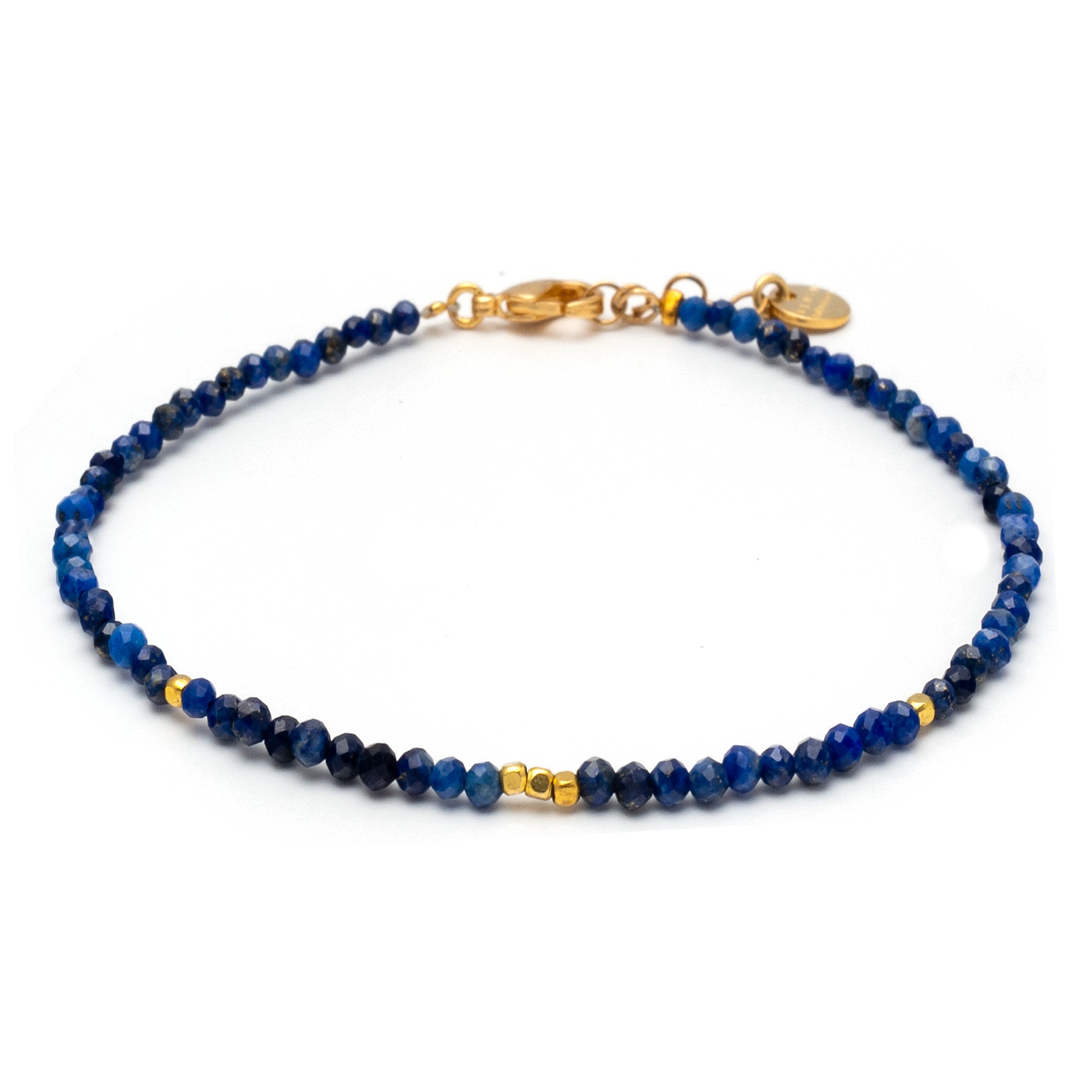 In a beguiling indigo blue, the bracelet of lapis lazuli and vgold-plated metal cubes shines on the wrist.