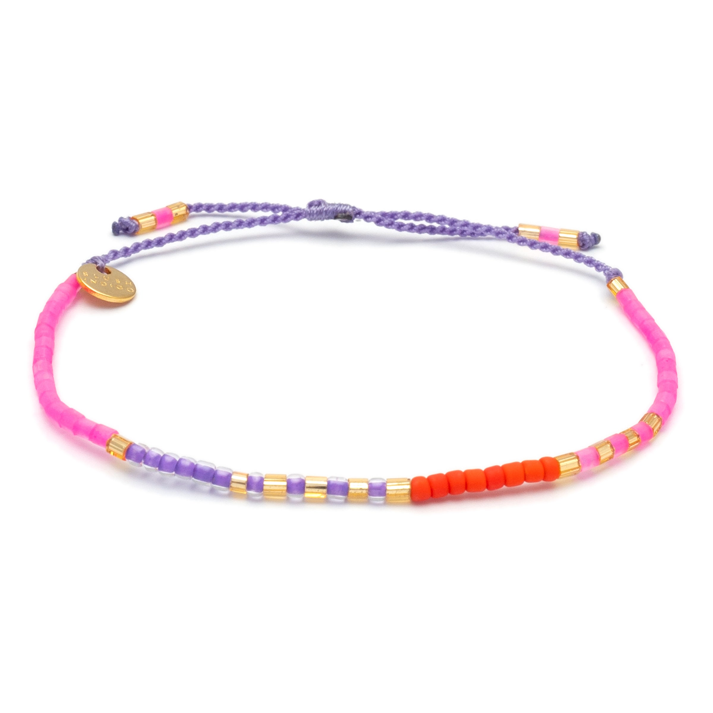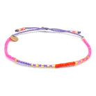 This bracelet is like a rain shower of confetti: beads in neon pink, matt orange and lilac are colorfully mixed. Shaken and stirred with some golden highlights.