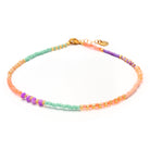 The colors of our Rhodes anklet shine in soft neon tones. In addition to coral, mint green and lilac, matte glass crystals in purple and neon-coral add elegant accents. The Rhodes series includes other anklets, bracelets and a necklace.