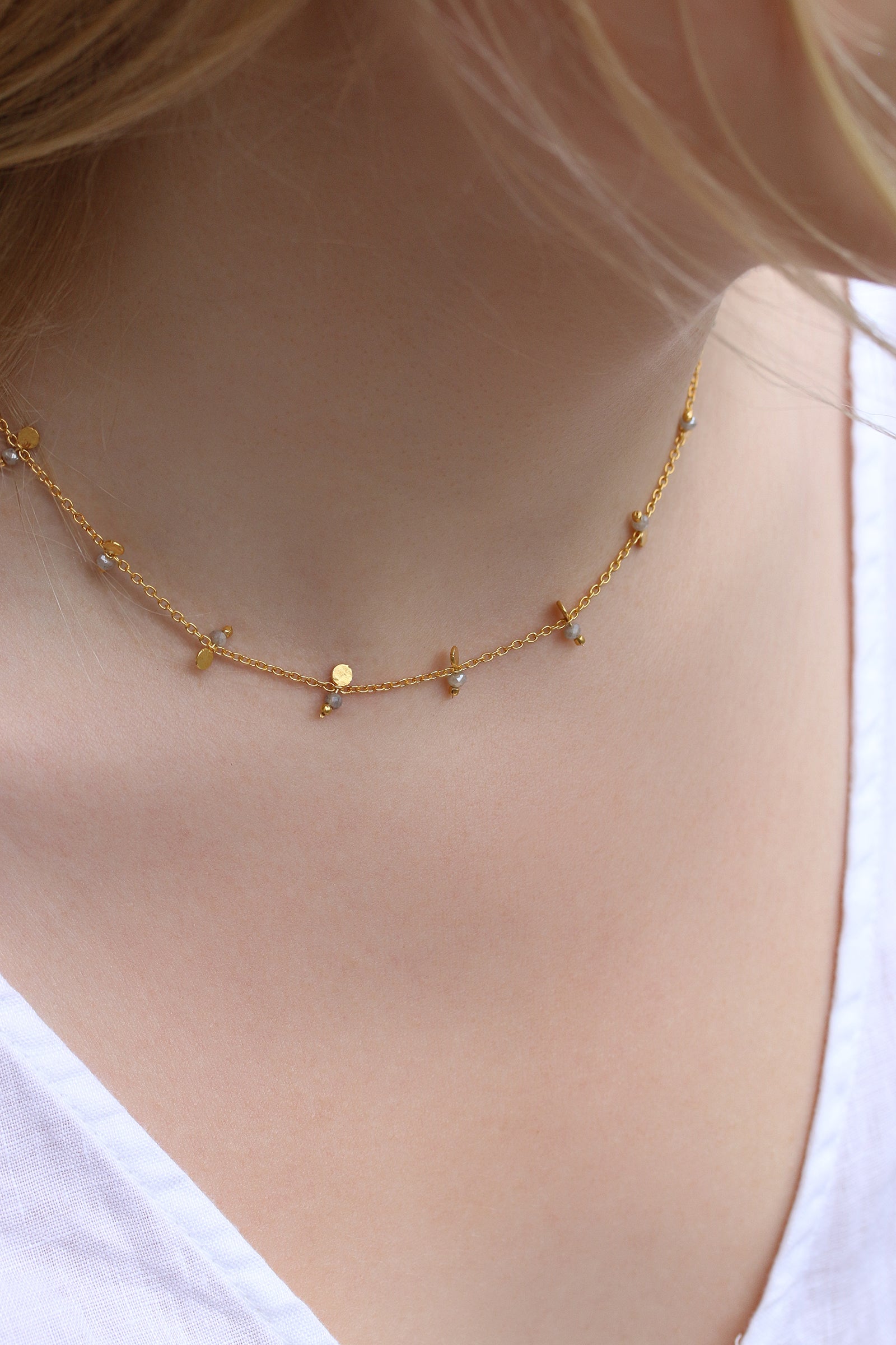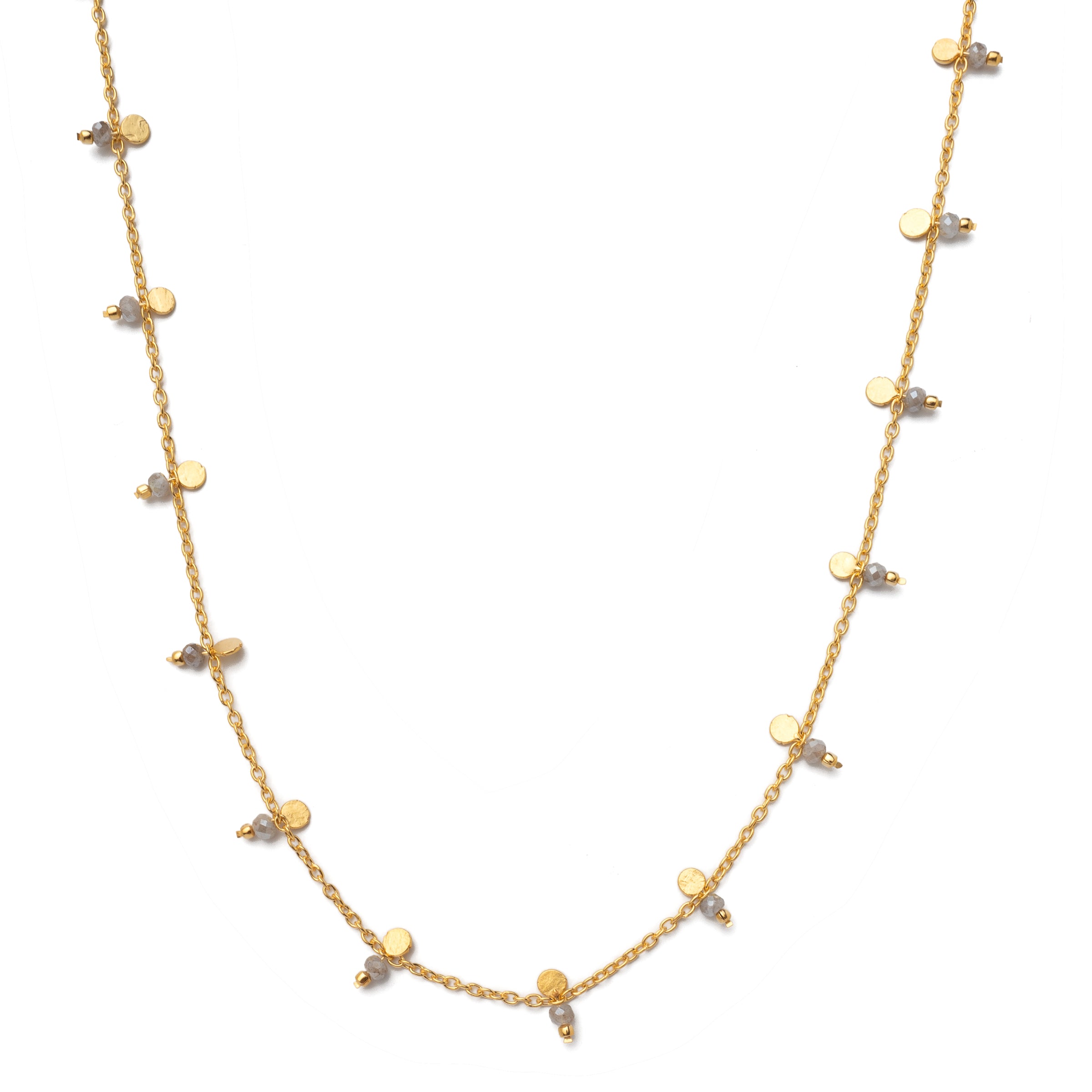 Numerous gold-plated irregular coins and light grey labradorite stones lie elegantly on the neck and make the Flying Coins necklace an elegant piece of jewellery with boho charm.