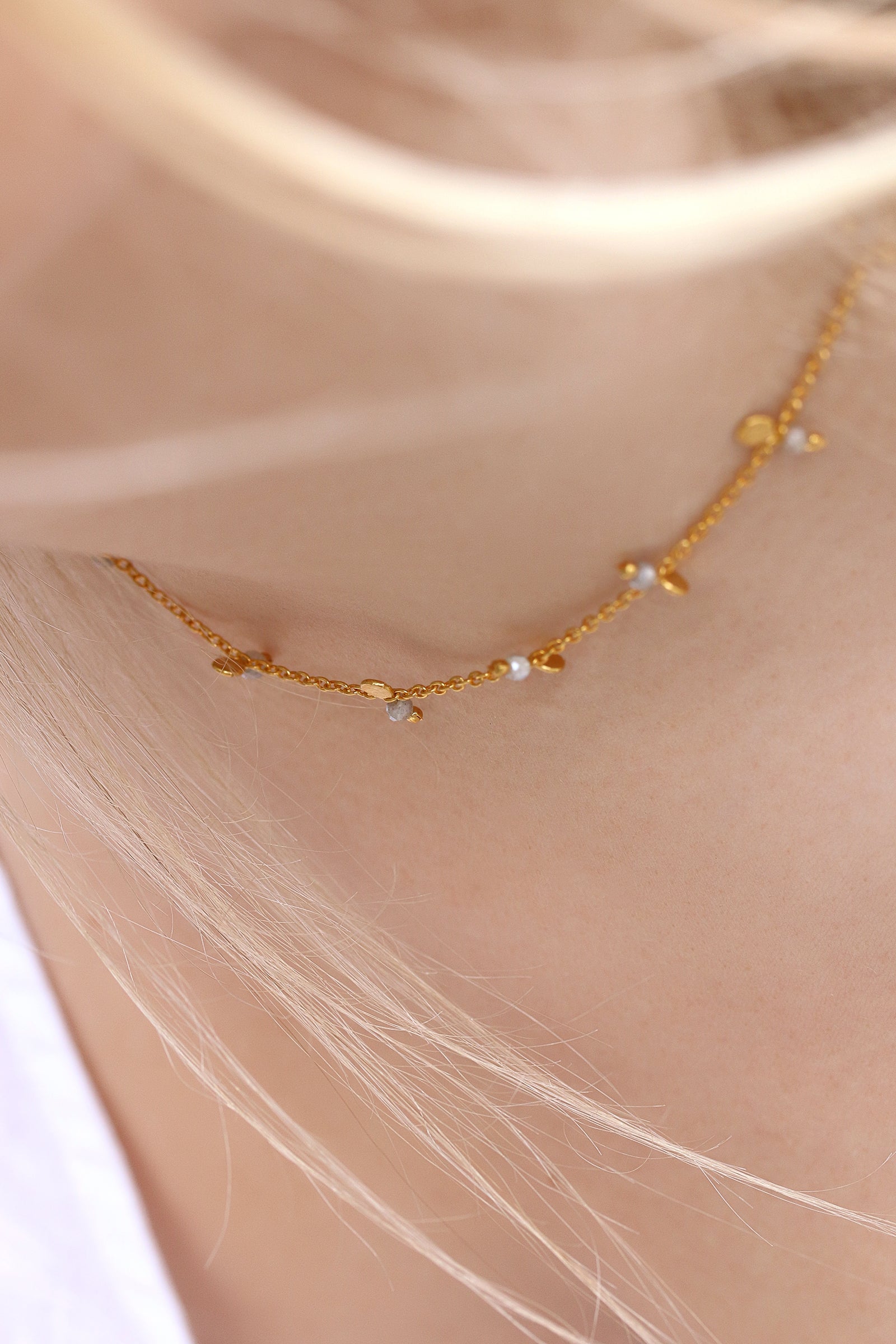 The necklace is 42 cm long and can be extended by 2 cm. The natural stones are always unique in their shape and colour. They measure about 2 mm. The necklace is made of 925 silver with 18k gold plating.