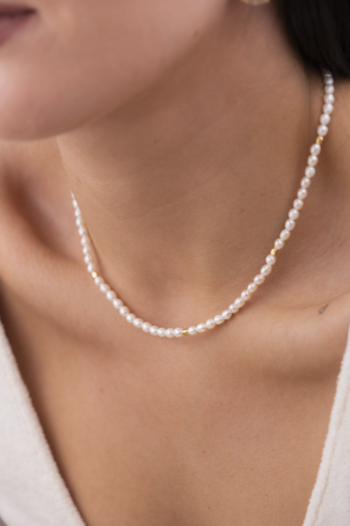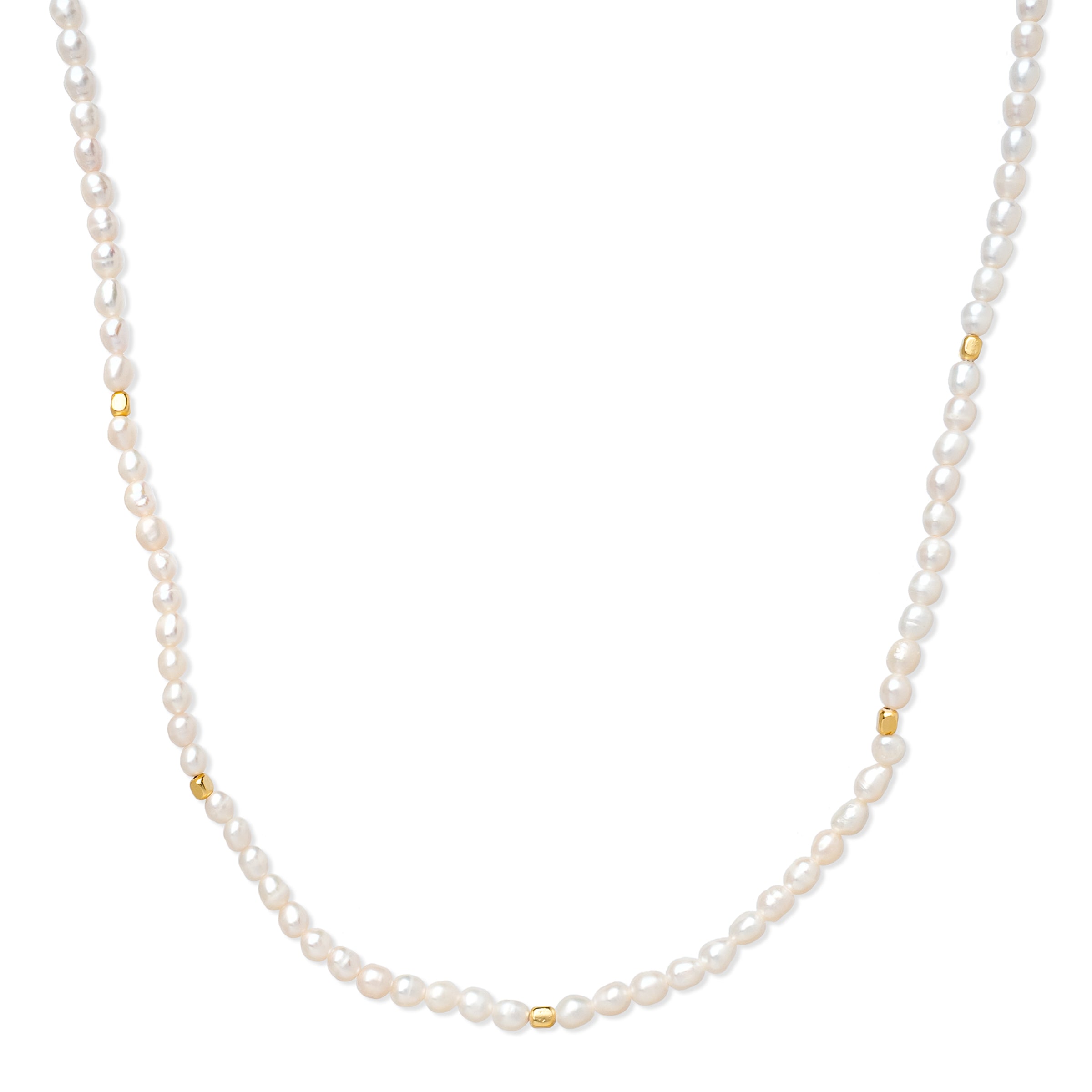 Our Sweet Pearl necklace is an elegant accessory that will enhance any wardrobe. The necklace from our Isola series is made of high quality freshwater pearls. The pearls have a size of approx. 4-5 mm and are strung on a length of 38 cm with a 1 mm gold-plated metal pearl in between.