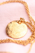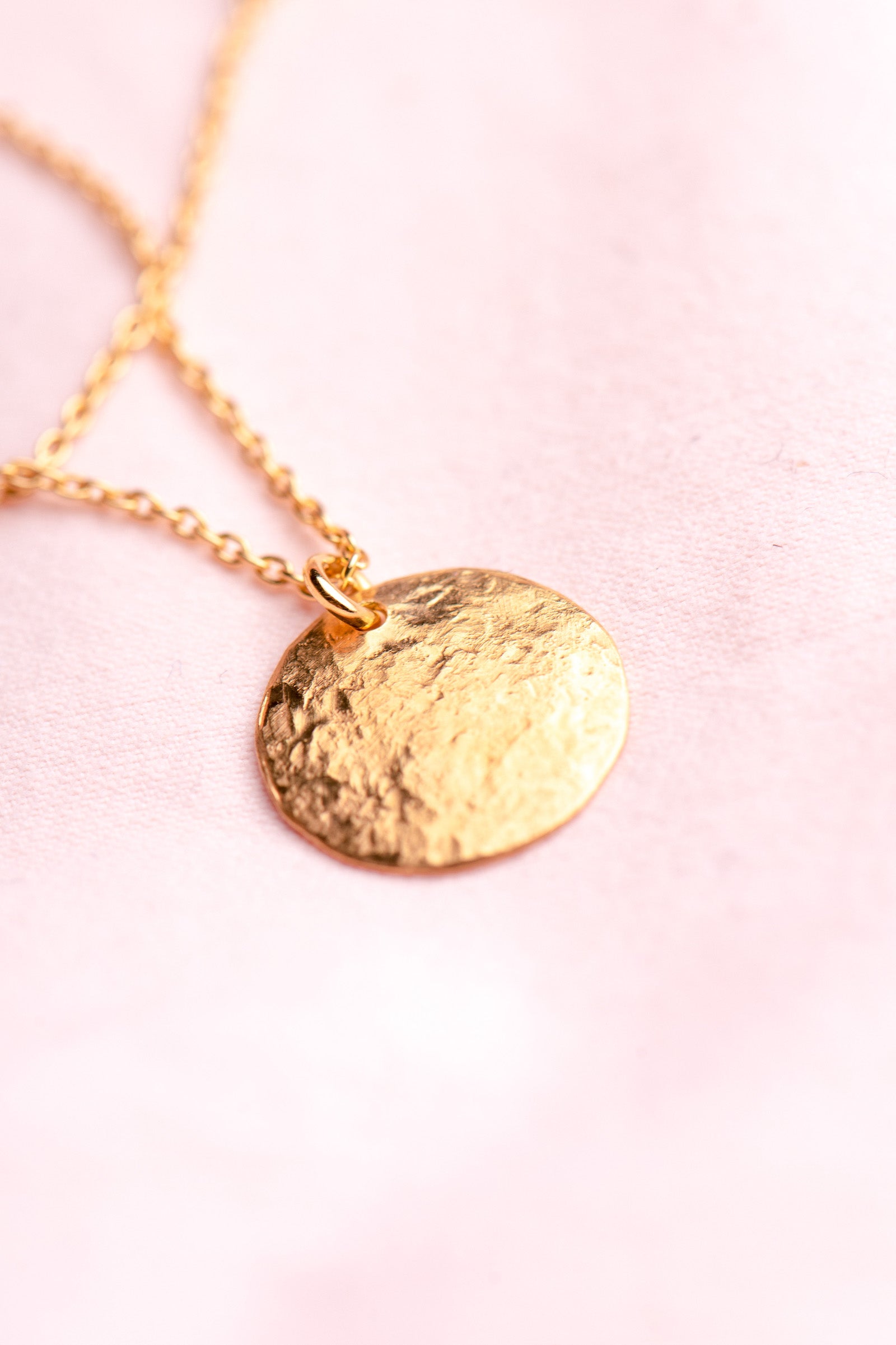 Our delicate necklace Moon delights with a circular hammered pendant reminiscent of the cratered landscape of a moon.