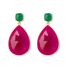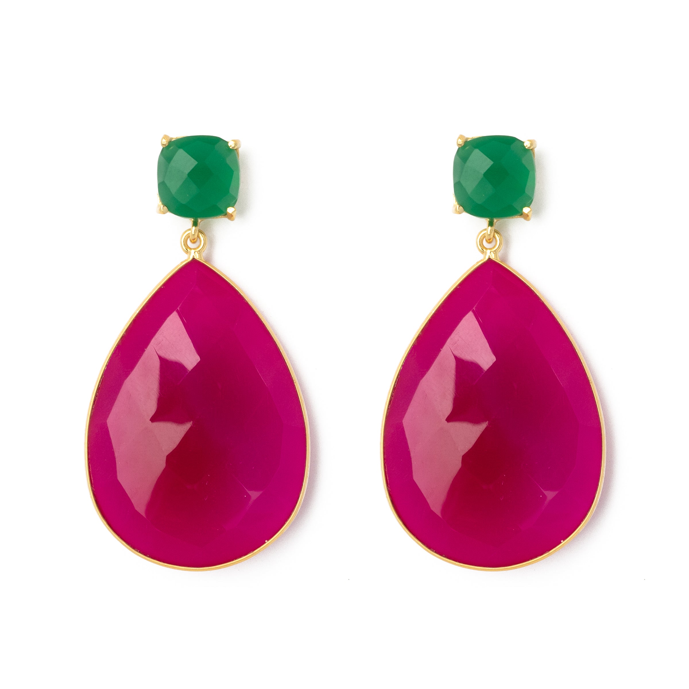 The earrings are made of 925 sterling silver and plated with 24-karat gold. The teardrop-shaped pink chalcedony measures 2 x 3 cm, and the green onyx stud earrings have a diameter of 1 cm. These are synthetic gemstones from India.