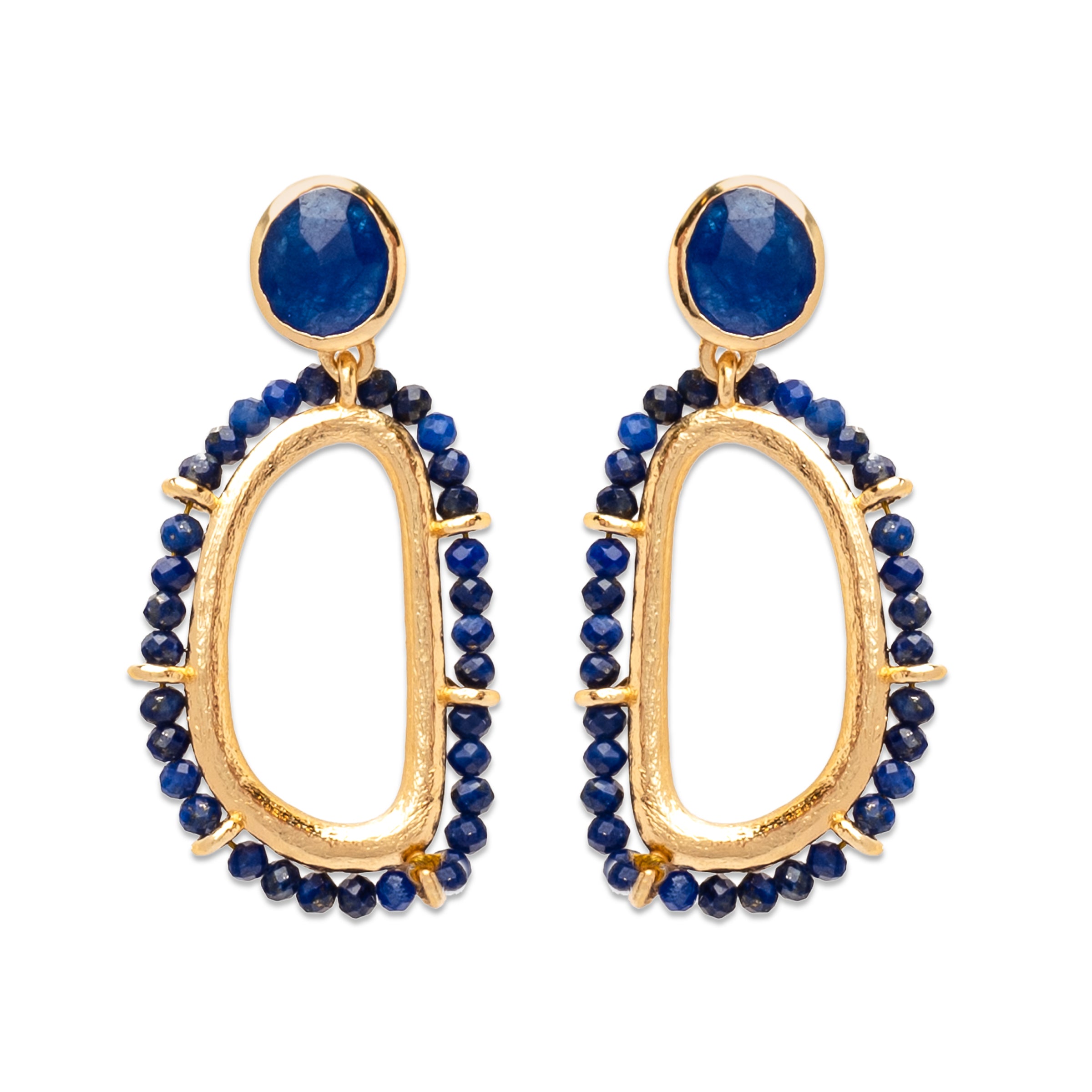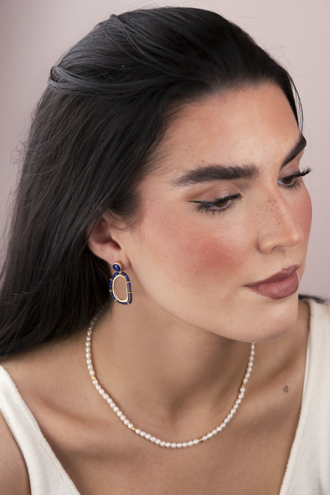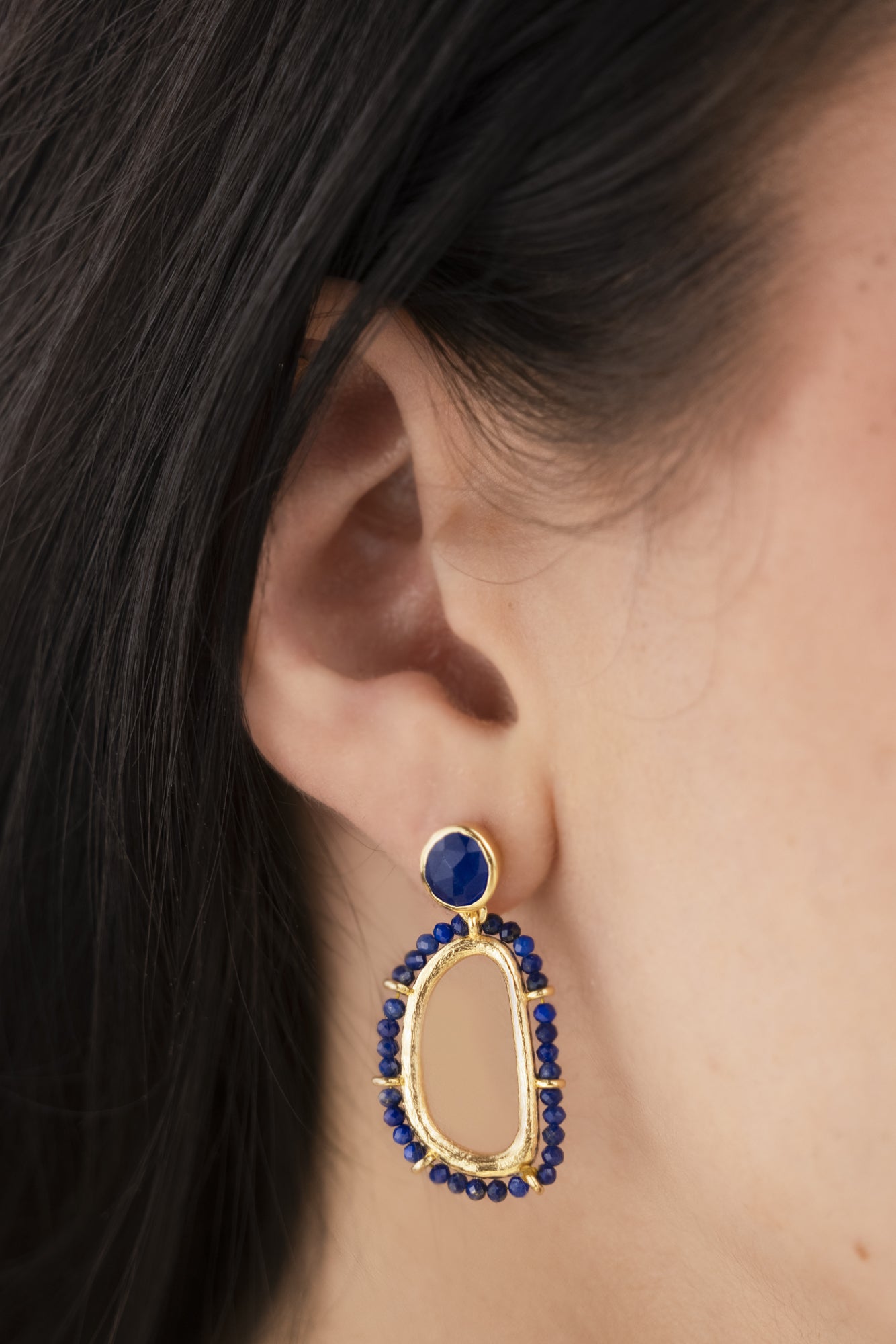 Numerous semiprecious stones made of dark blue lapis lazuli frame the oval pendant of our Laguna earrings. This pendant hangs from a circular ear stud made of blue jade.
