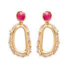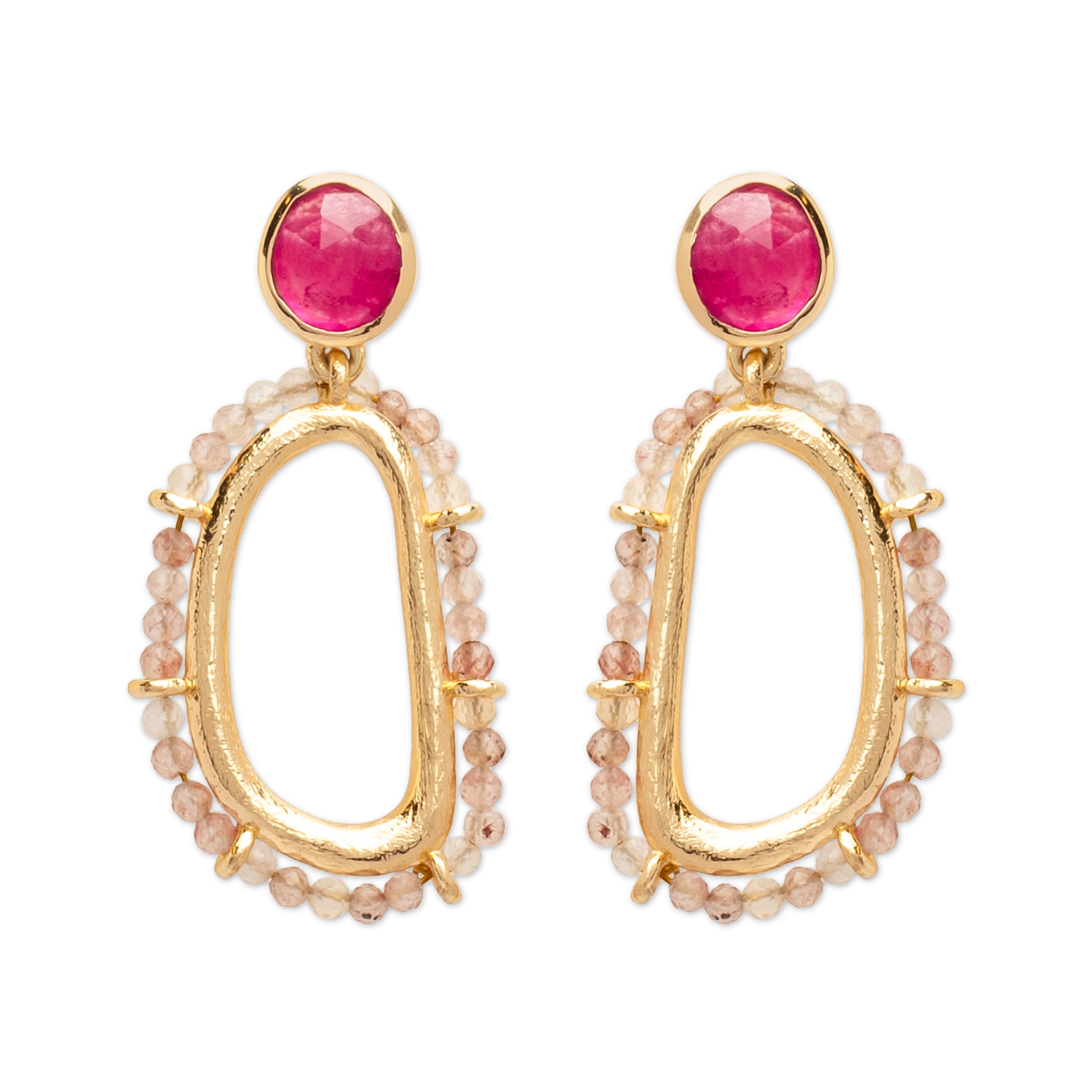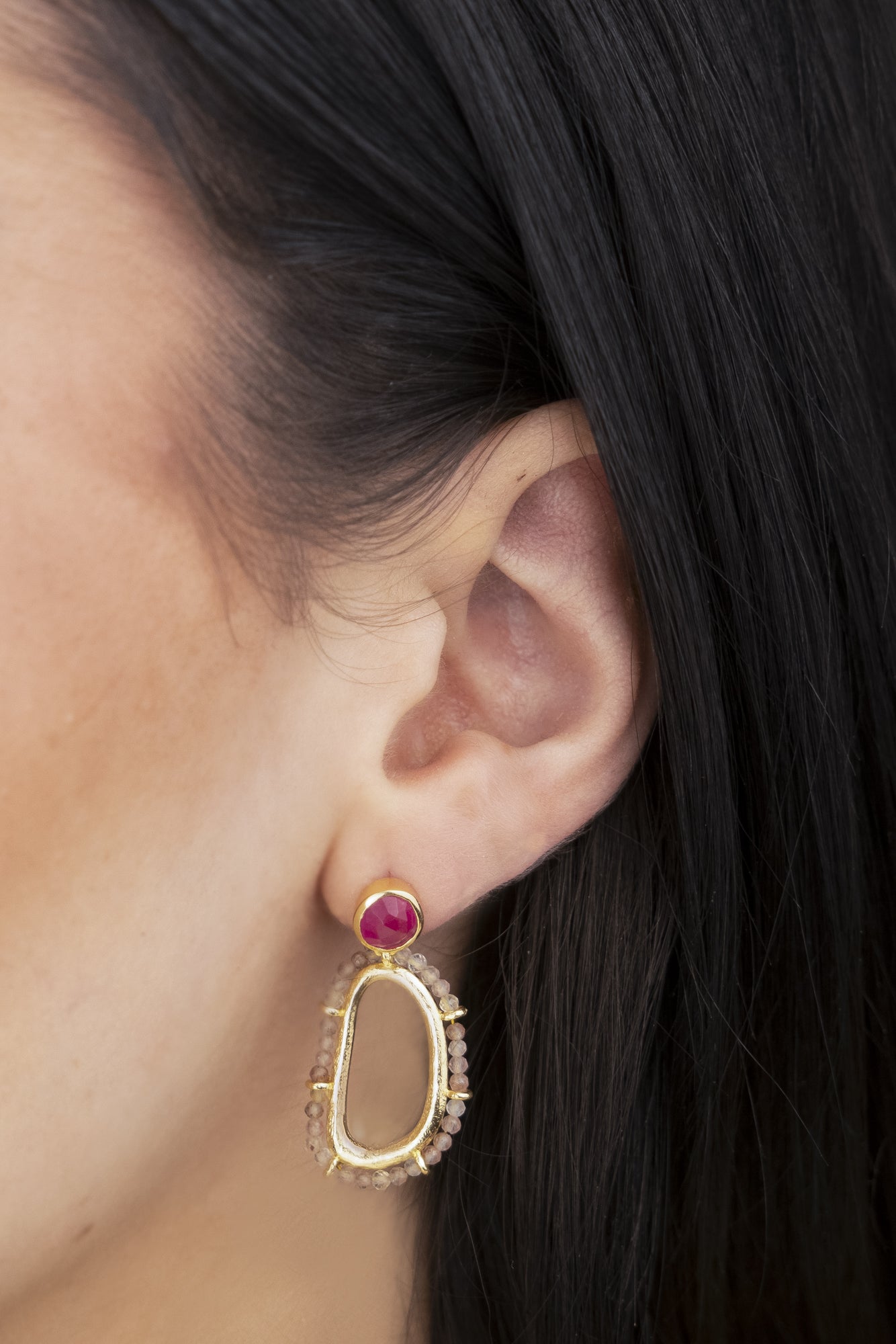 Numerous semiprecious strawberry quartz stones frame the oval pendant of our Laguna earrings. This pendant hangs from a circular pink jade ear stud.