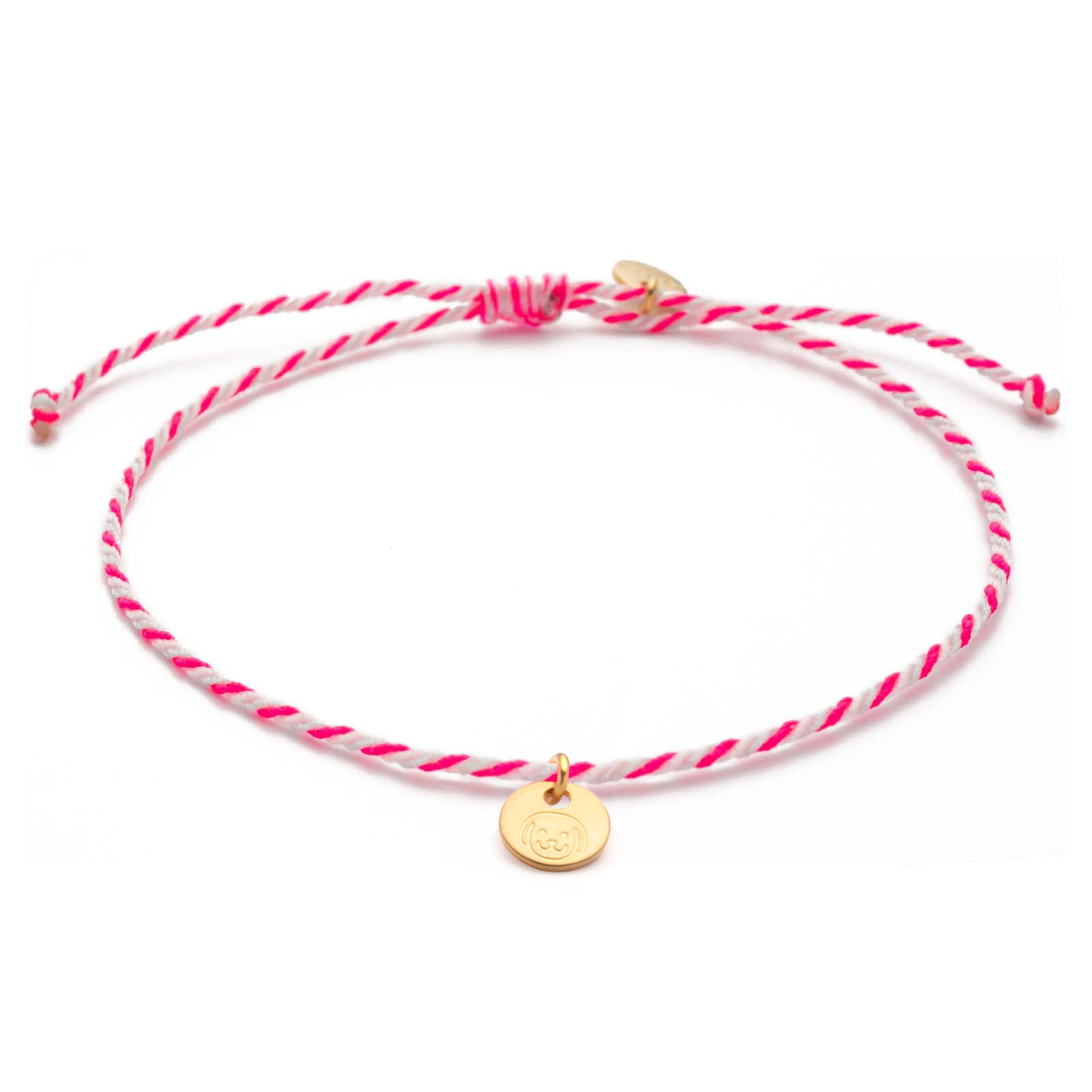 The circular 10 mm smiley pendant isavailable in gold and silver . The ribbon can be adjusted in size by a knot closure. All metal parts used are made of 24k gold plated brass and originate from Germany and Italy.