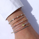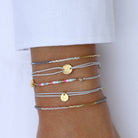 A tiny treasure of a bracelet. One line of the smallest hexagon glass beads embraces your wrist closing with a dainty carabiner, extension chain and logo tag. It is about 17 cm long and can be extended up to 2 cm. All metal pieces are 24k gold dipped made in Germany and Italy.