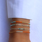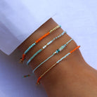 A tiny treasure of a bracelet. One line of the smallest hexagon glass beads embraces your wrist closing with a dainty carabiner, extension chain and logo tag. It is about 17 cm long and can be extended up to 2 cm. All metal pieces are 24k gold dipped made in Germany and Italy.