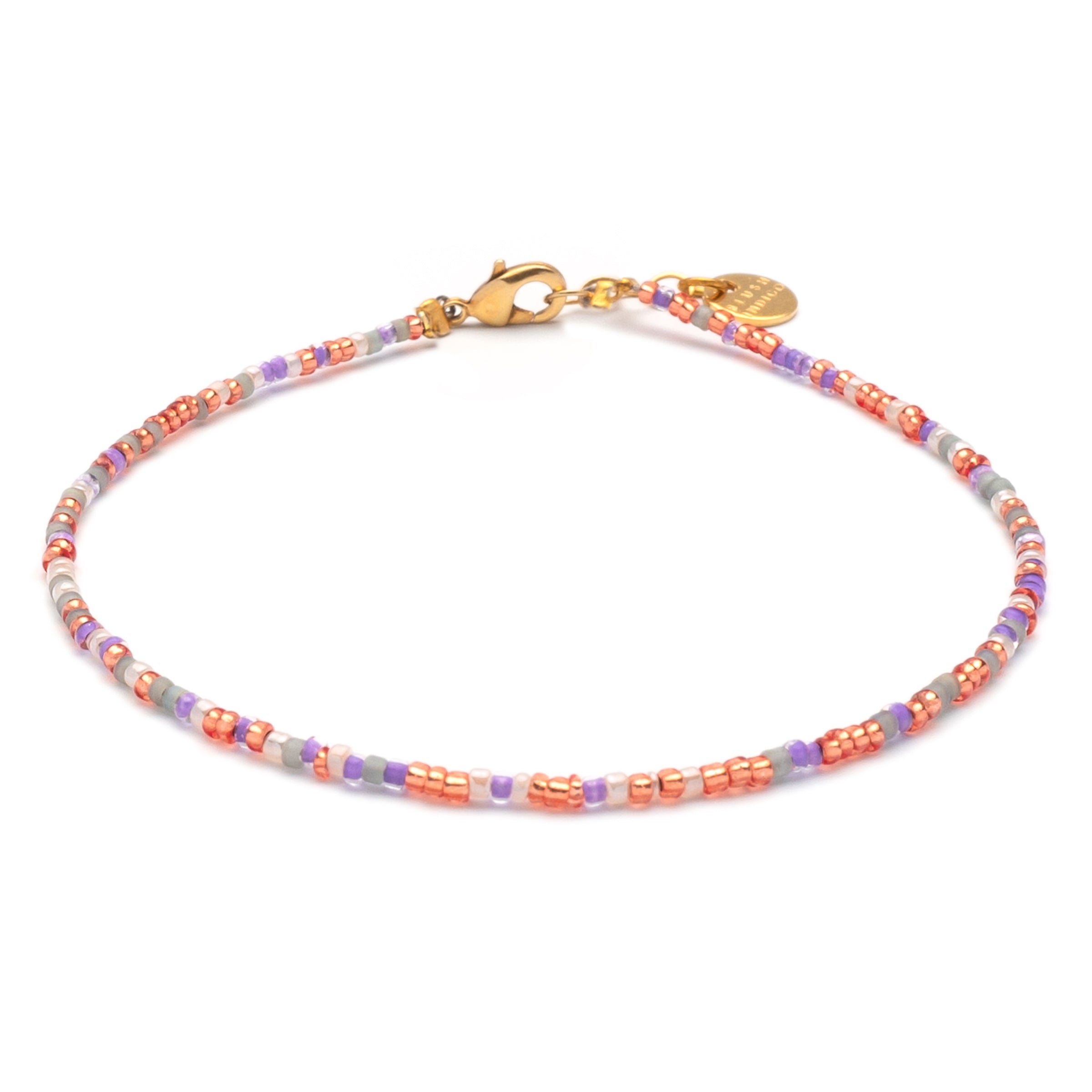 A tiny treasure of a bracelet. One line of the smallest hexagon glass beads embraces your wrist closing with a dainty carabiner, extension chain and logo tag. It is about 17 cm long and can be extended up to 2 cm. All metal pieces are 24k gold dipped made in Germany and Italy.