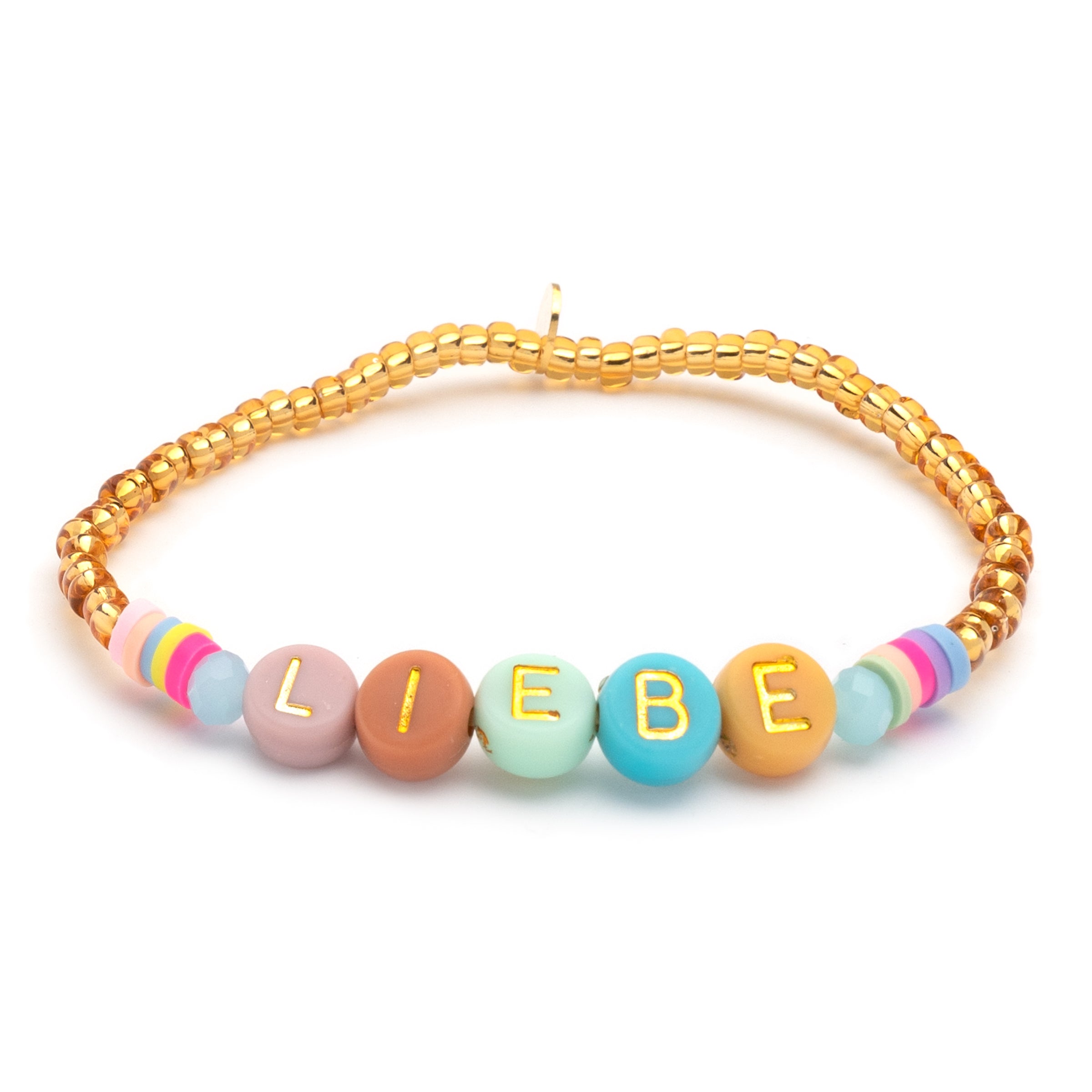 All you need is ... Liebe! The gold arm candy with dark letter beads is cute to nibble on. The round letters are framed by colorful crystal beads and colorful rubber Heishi Pearls. All beads are randomly selected. This means that no two bracelets are alike.
