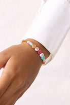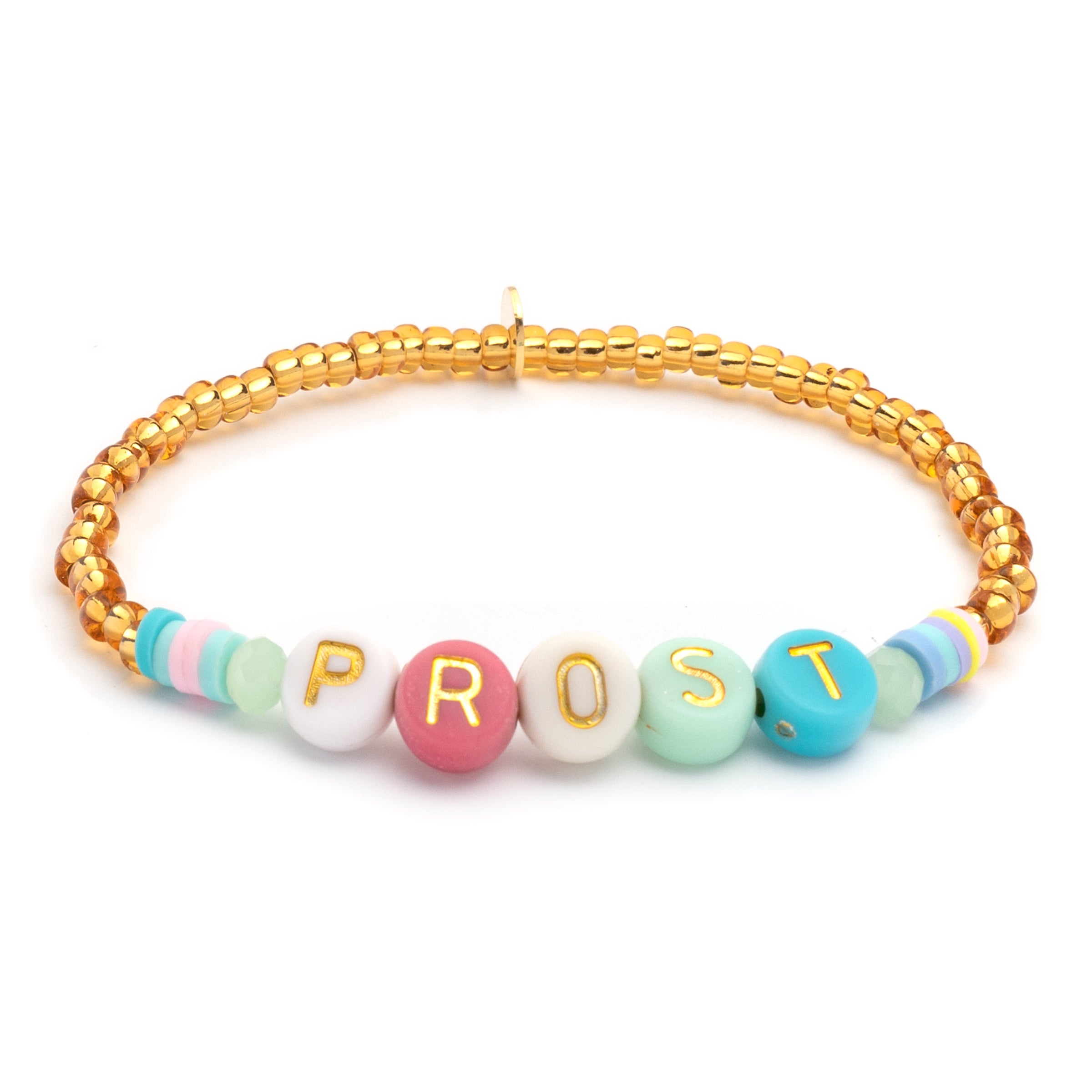 Cheers, Baby! The gold arm candy with dark letter beads is cute to nibble on. The round letters are framed by colorful crystal beads and colorful rubber Heishi Pearls. All beads are randomly selected. This means that no two bracelets are alike.