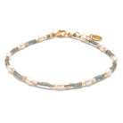 Eleven tiny freshwater pearls mixed together with frosted beads in Frosted Grey embrace your wrist. Scattered gold beads provide an elegant finish.
