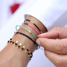 A small disc held together by black nylon yarn will make this bracelet your new darling.