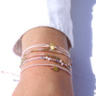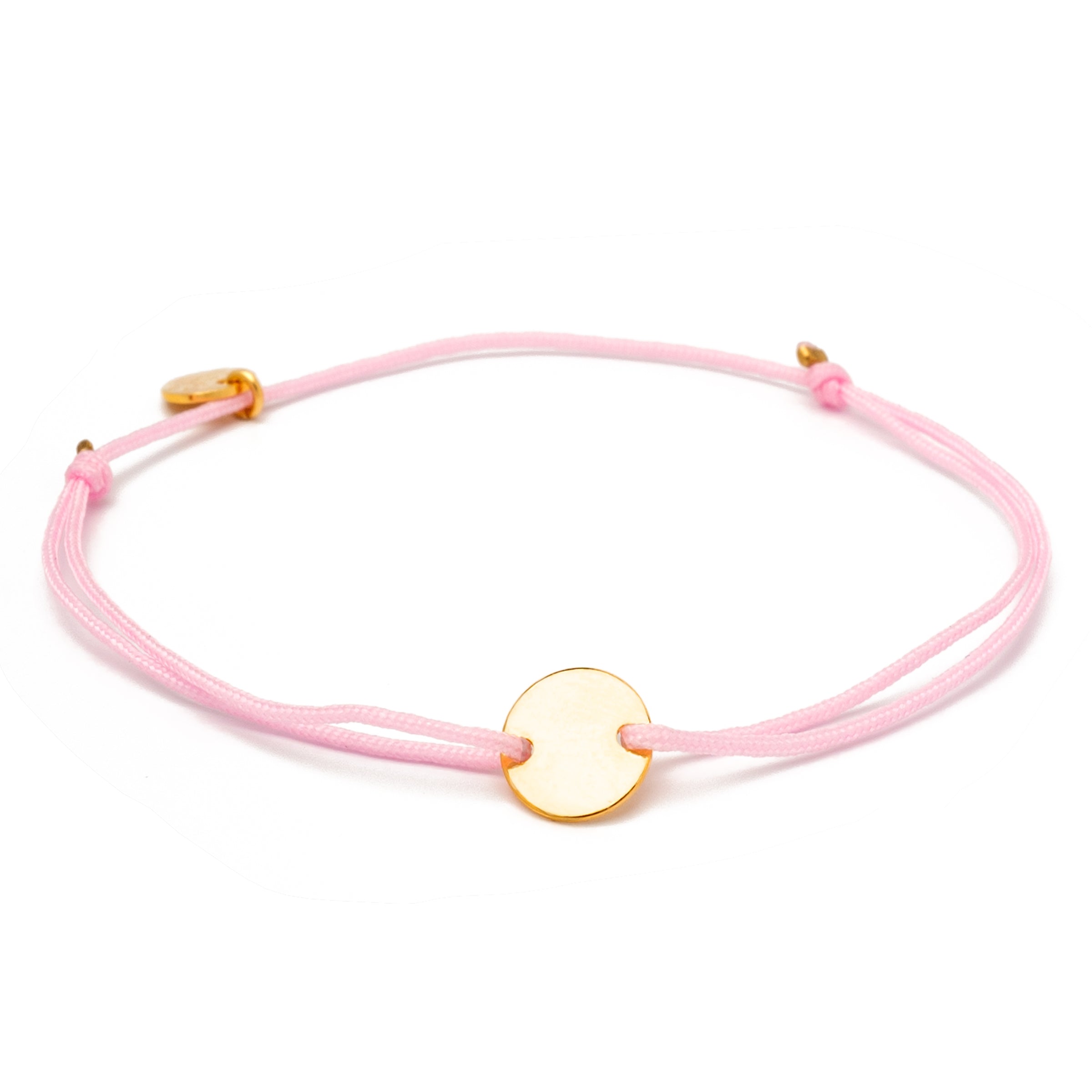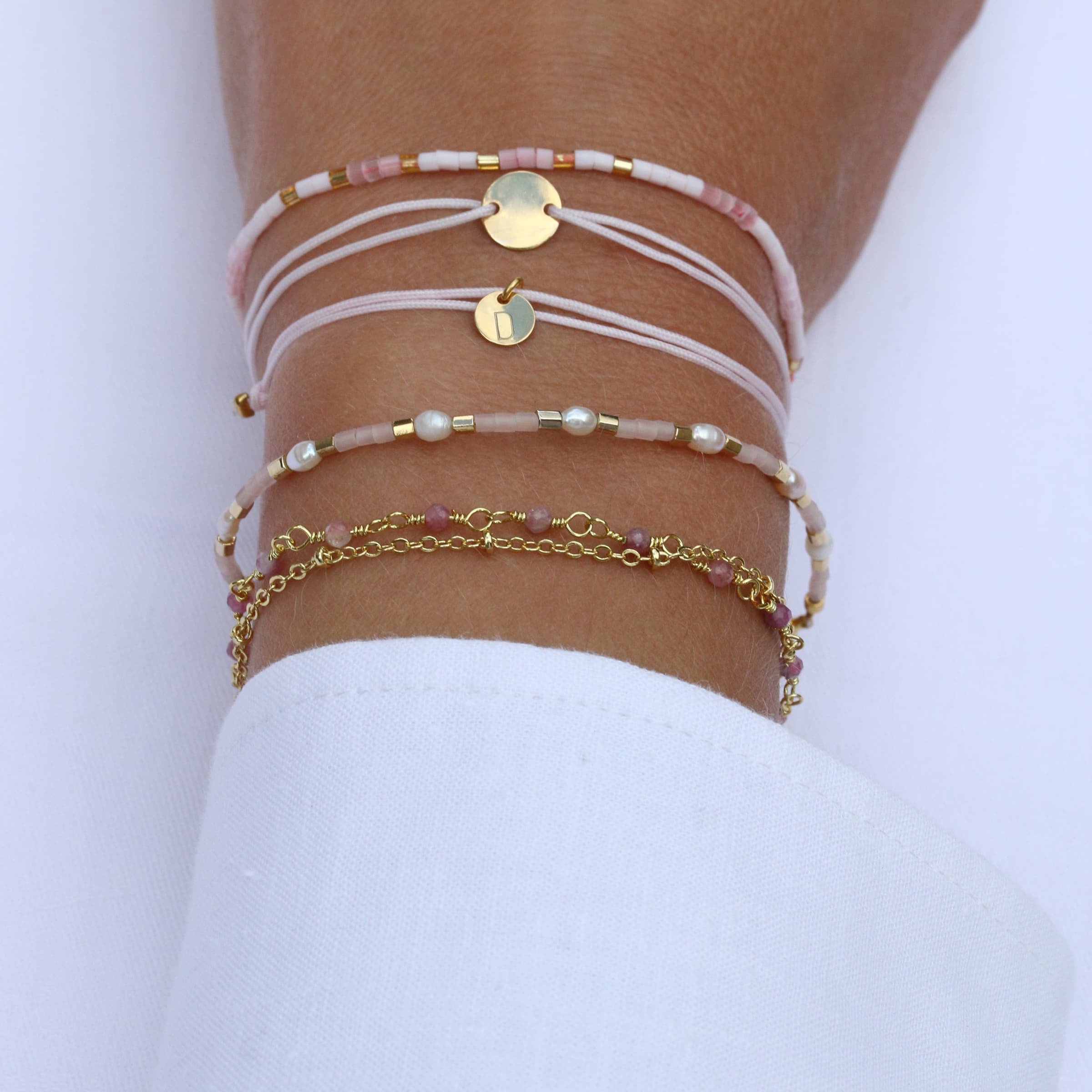 A small disc held together by nylon yarn in Light Rose will make this bracelet your new darling.