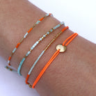 A small disc held together by nylon yarn in Neon Orange will make this bracelet your new darling.