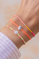 A small disc held together by nylon yarn in Neon Orange will make this bracelet your new darling.