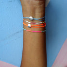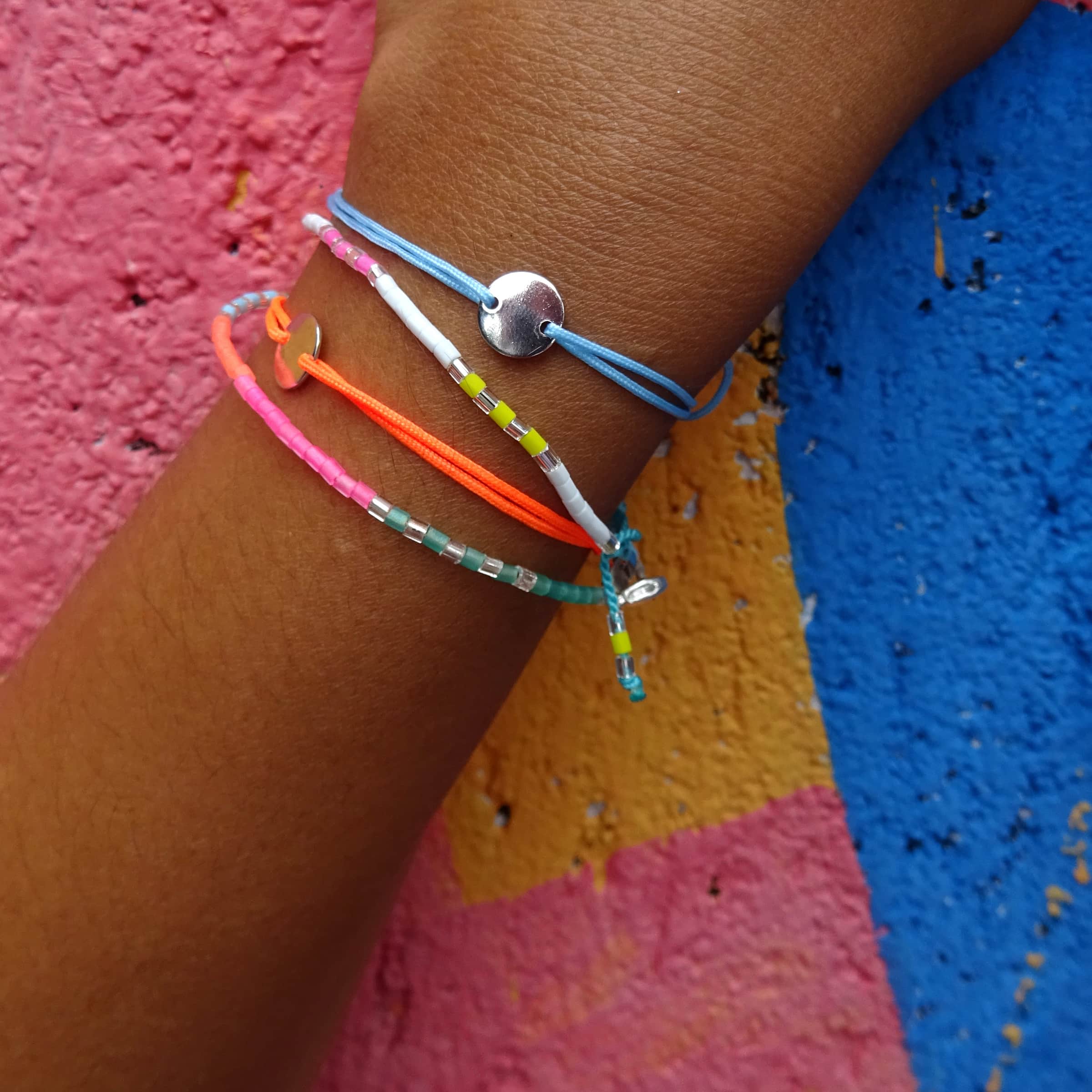 A small disc held together by nylon yarn in Sky Blue will make this bracelet your new darling.