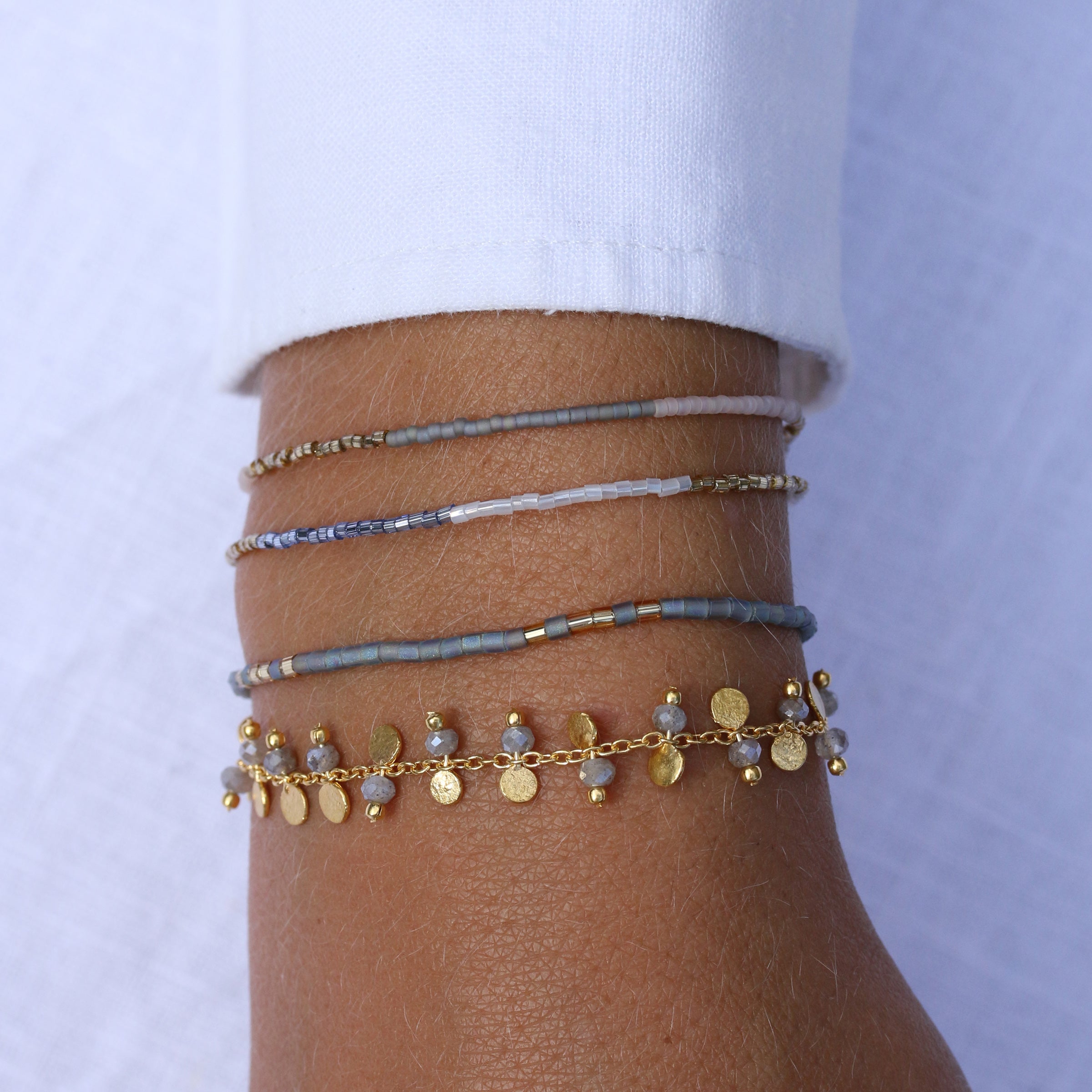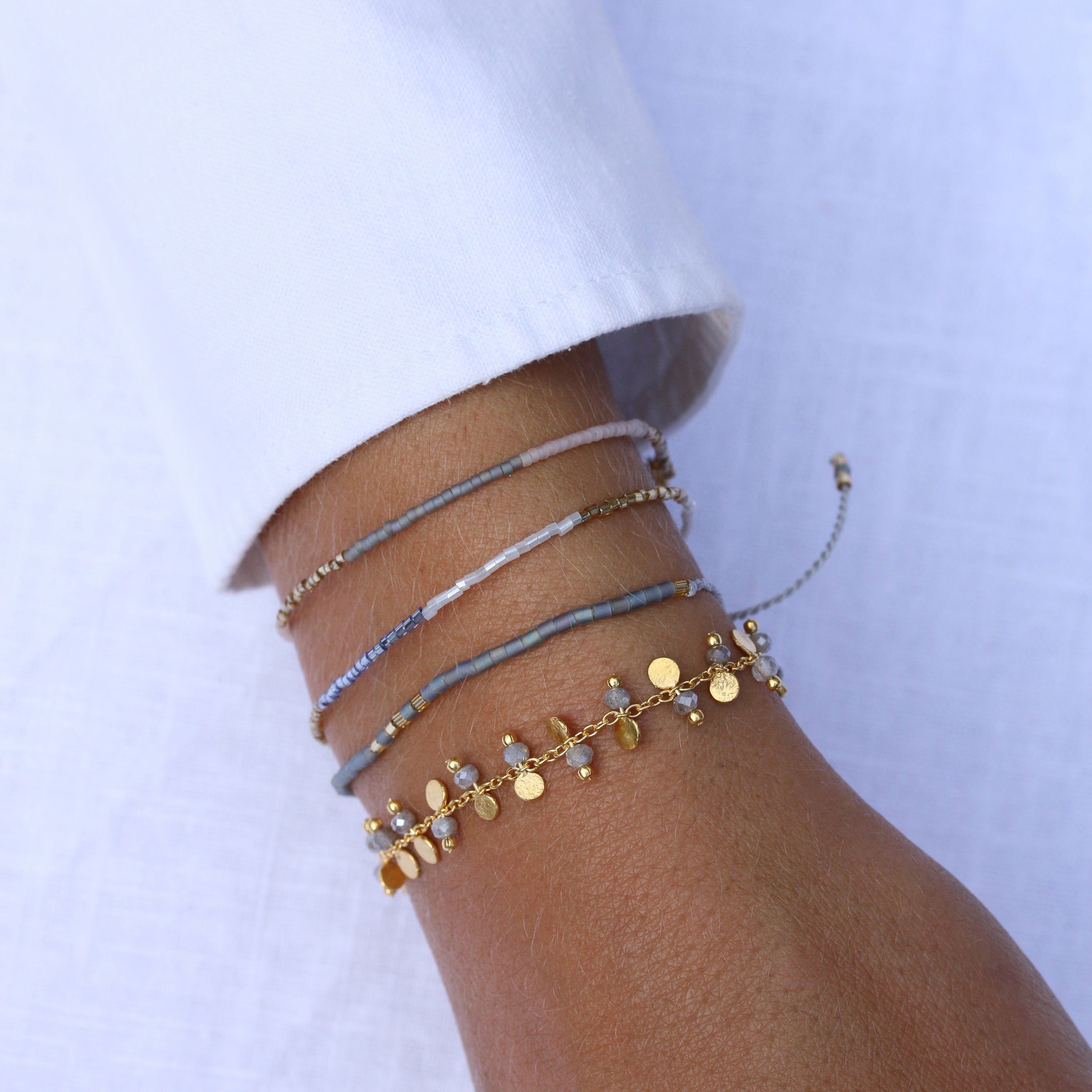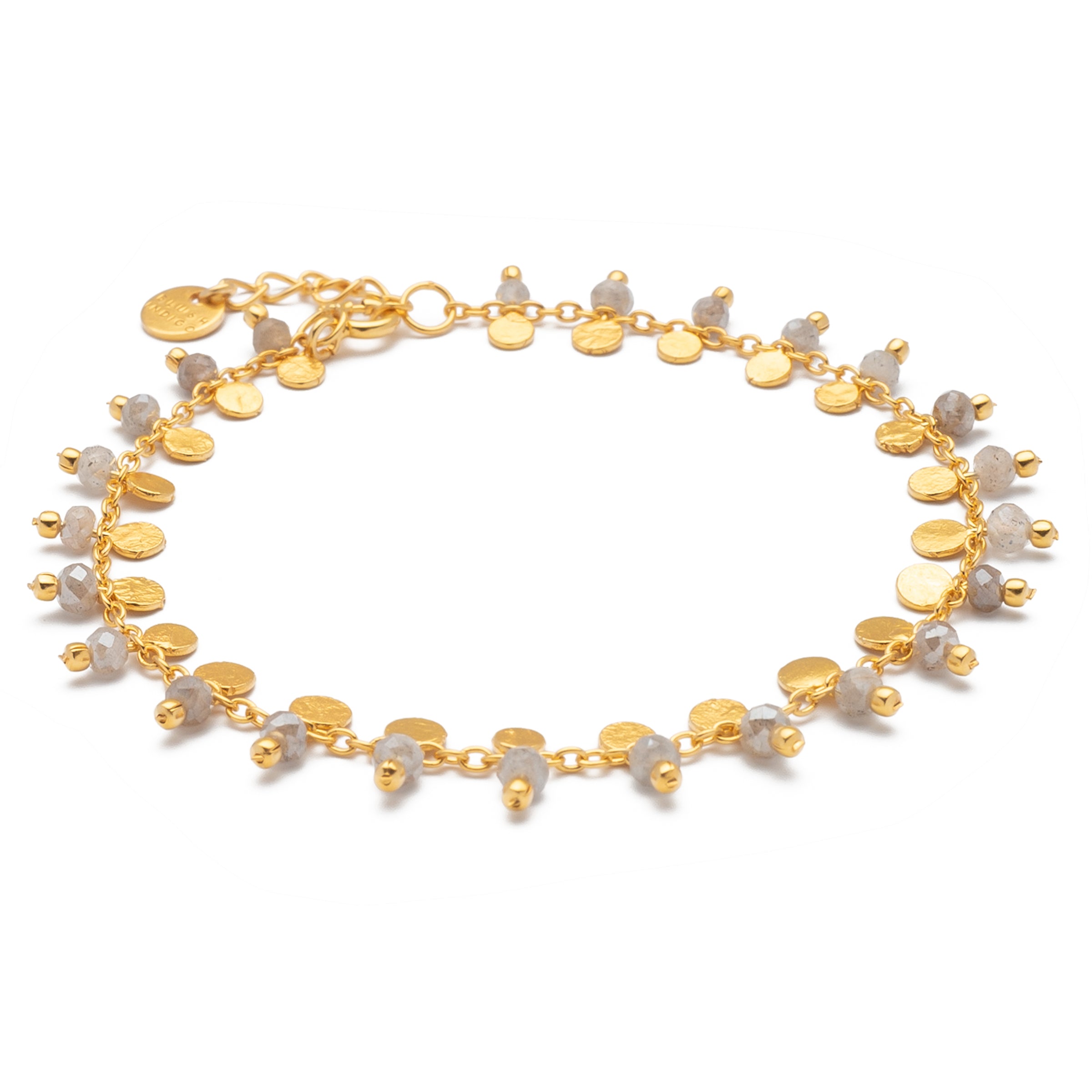 Grey labradorite stones make the Multi Coins bracelet a summer statement piece on your wrist. Made from 925 silver it enchants with its numerous gold-plated irregular coins that provide additional movement.