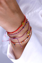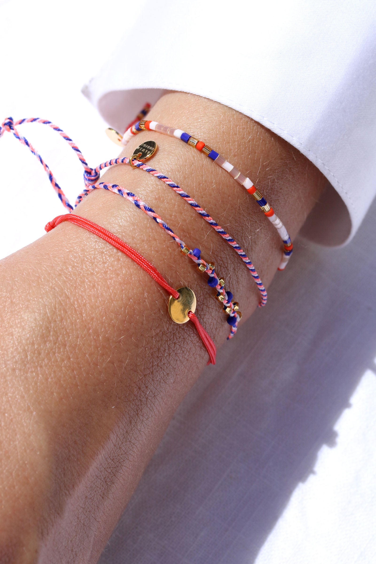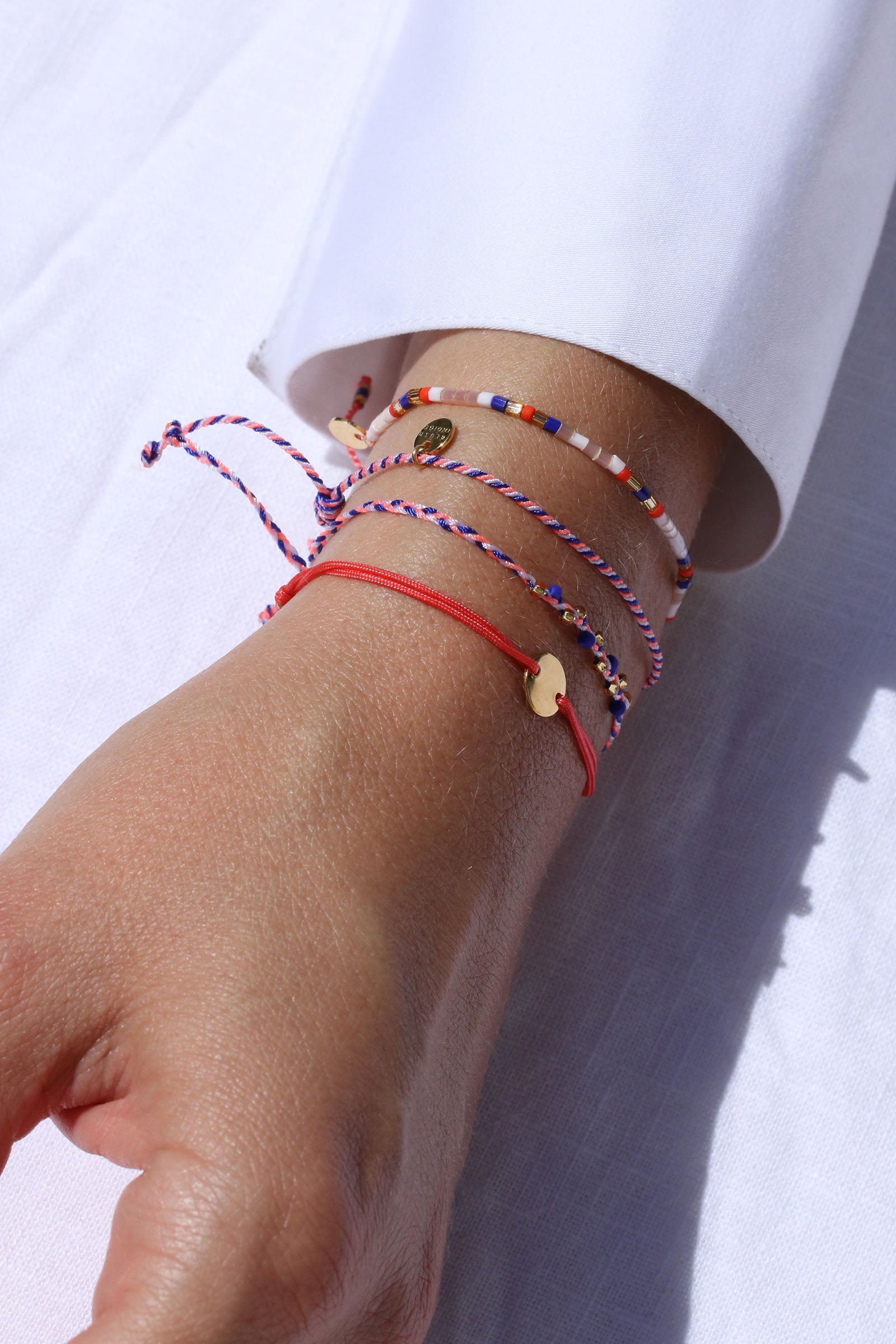 Orange and Indigo Blue team up for our Sweet String Bracelet Living Coral made of nylon yarn in dark coral. We added