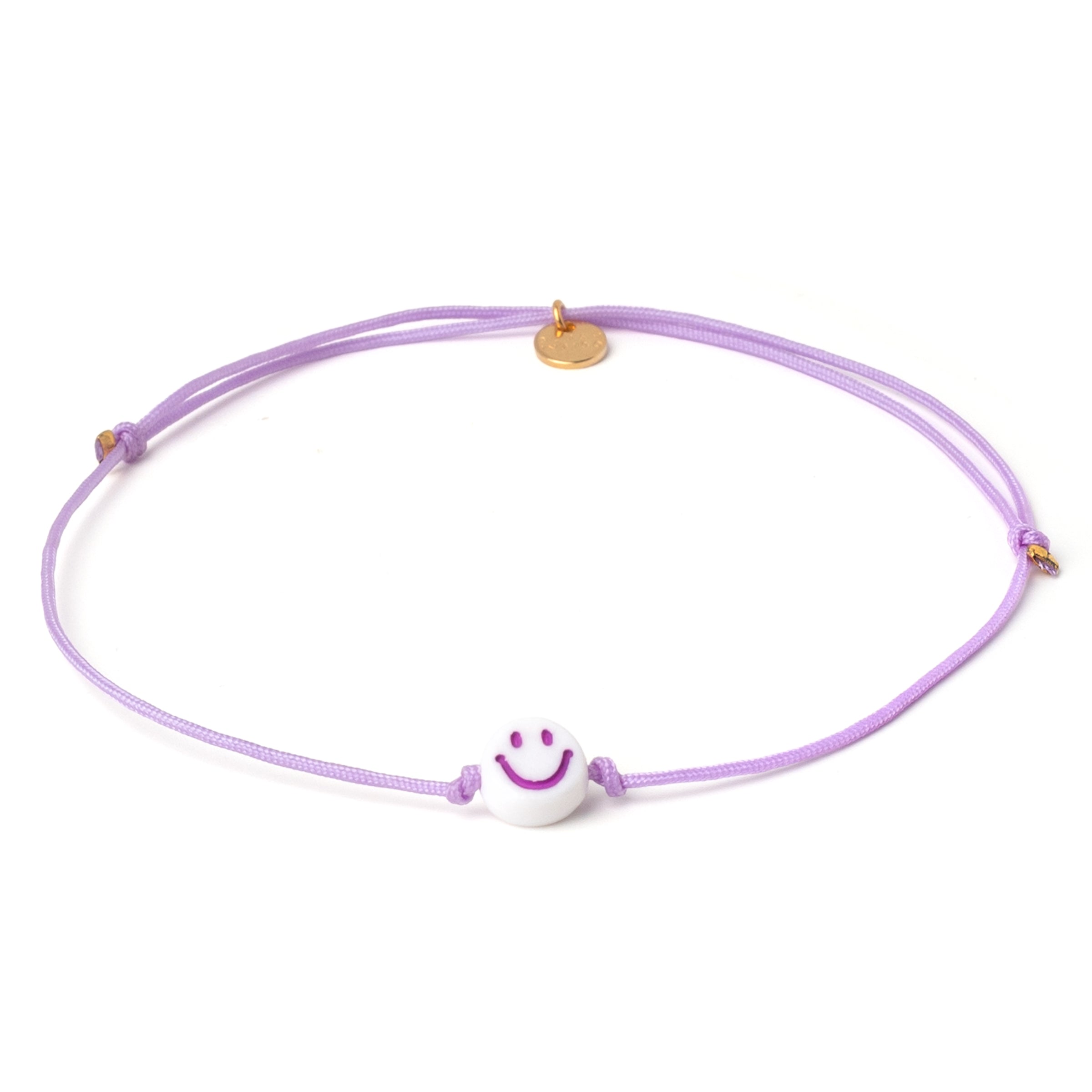 A small detail guaranteed to brighten your day: Our anklet consists of a solid-colored nylon band in violet and a single smiley face bead. It will accompany you barefoot on the beach, through warm nights, and on all your summer adventures.