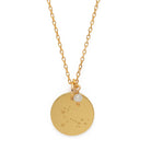 The 1,3 cm high-polished disk pendant shows the star constellation of the zodiacs sign. Attached is a circular birthstone that measures 2-3 mm. The chain made of 18k gold-plated 925