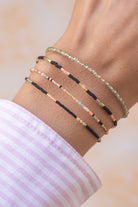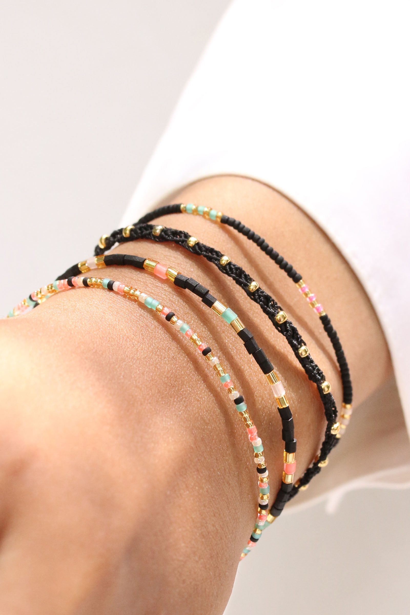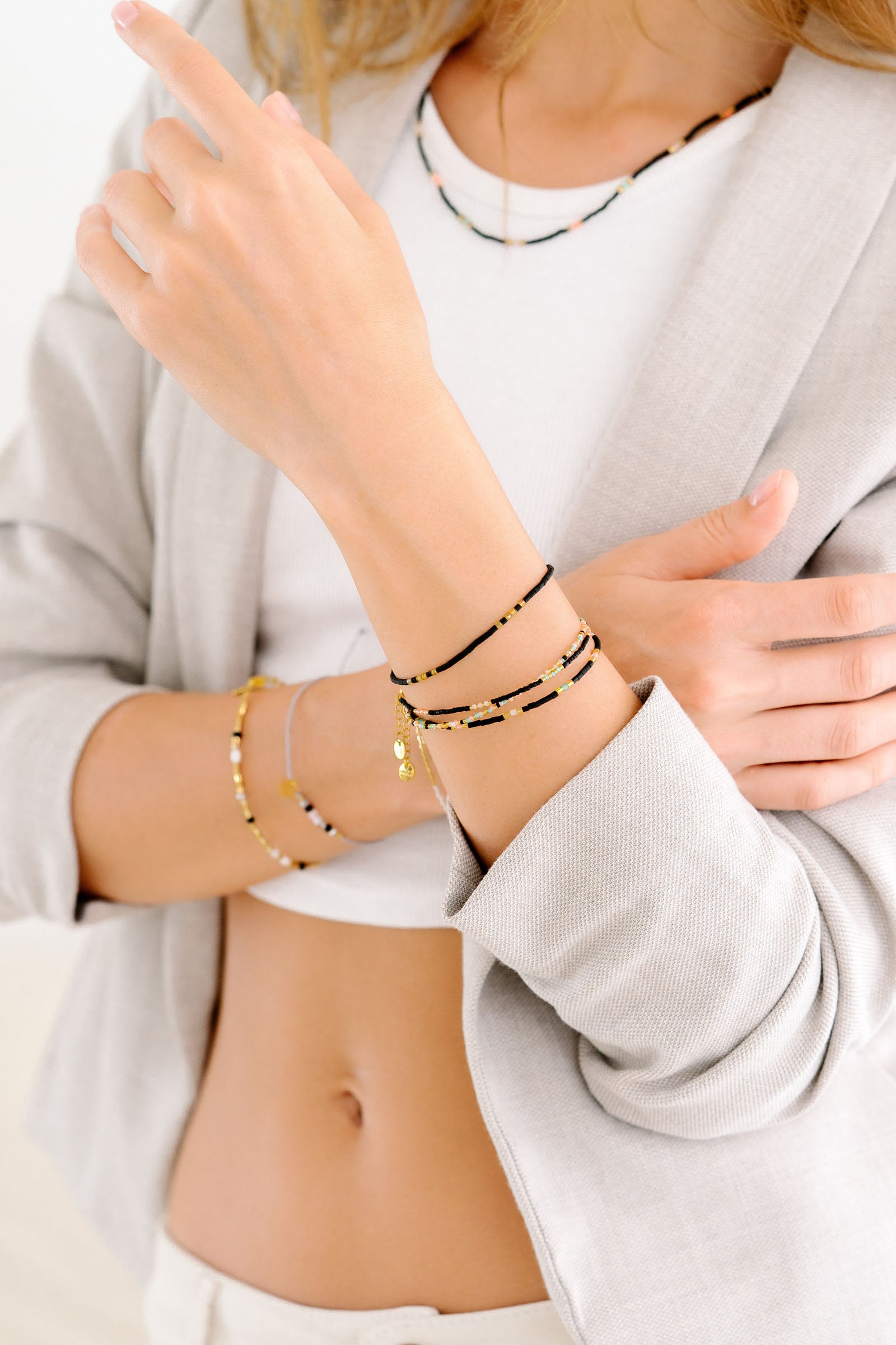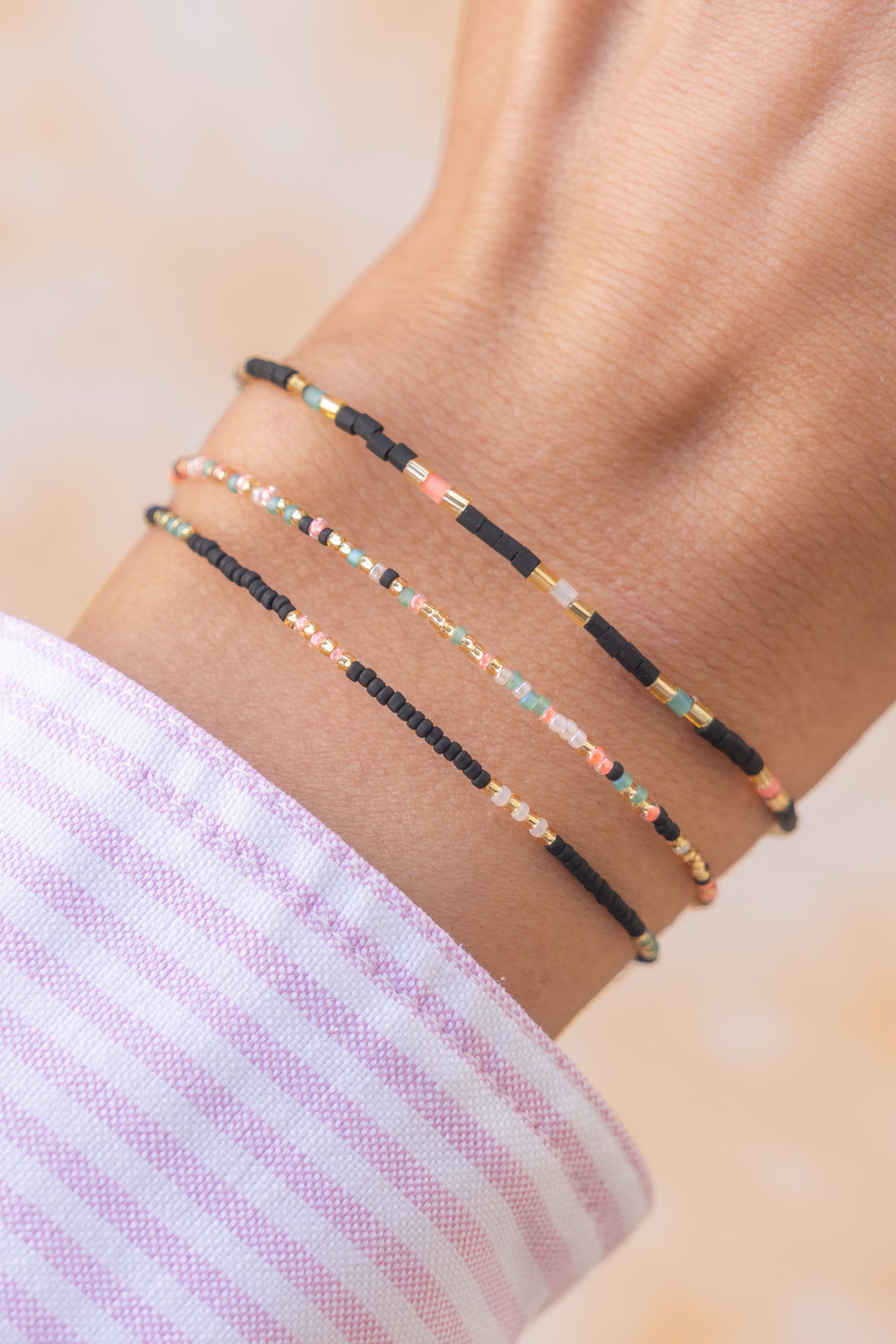 The gold bracelet Marrakesh consists of matt black pearls with well-dosed splashes of color in neon coral, ocean green and frosted blush.
