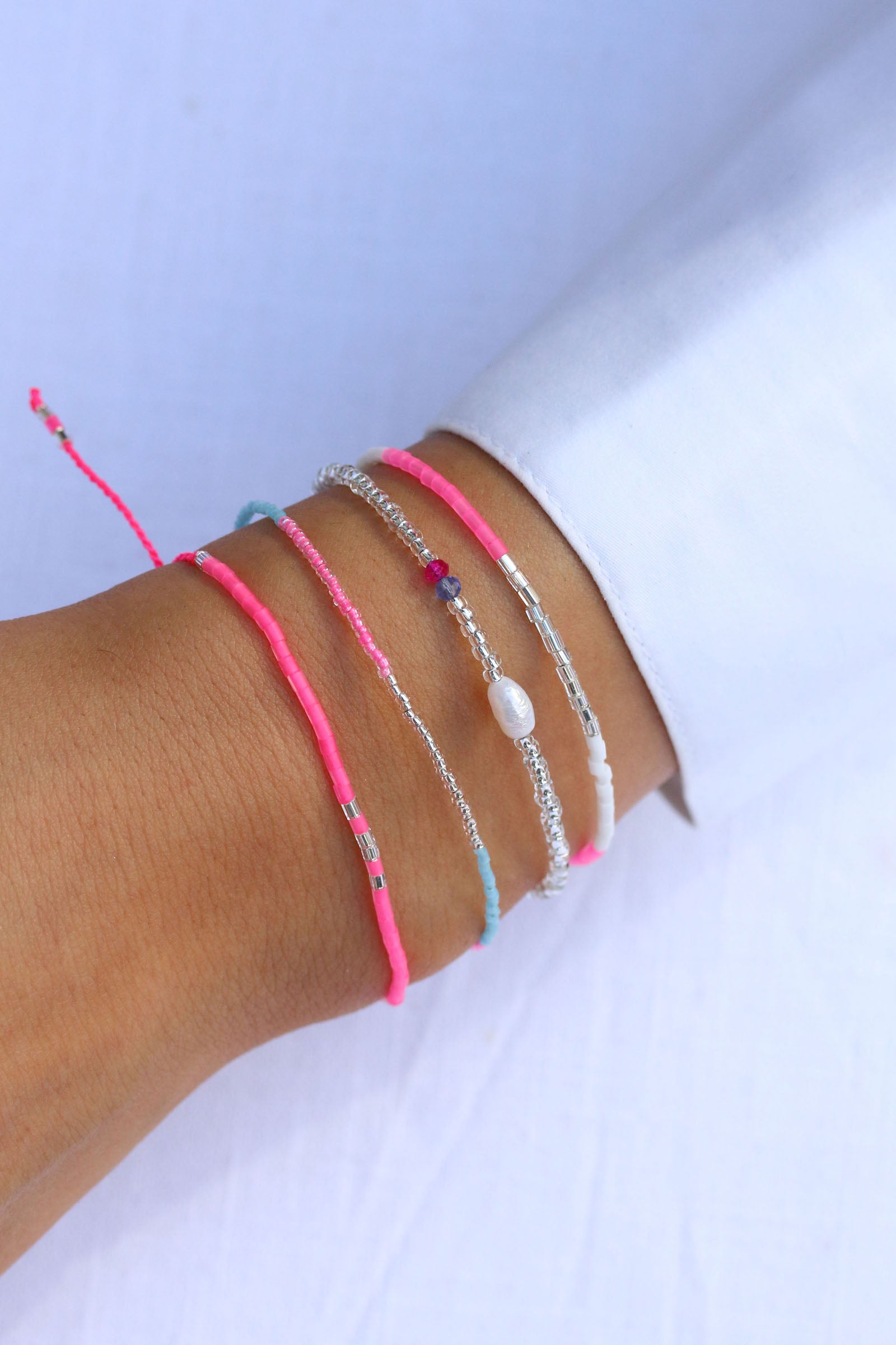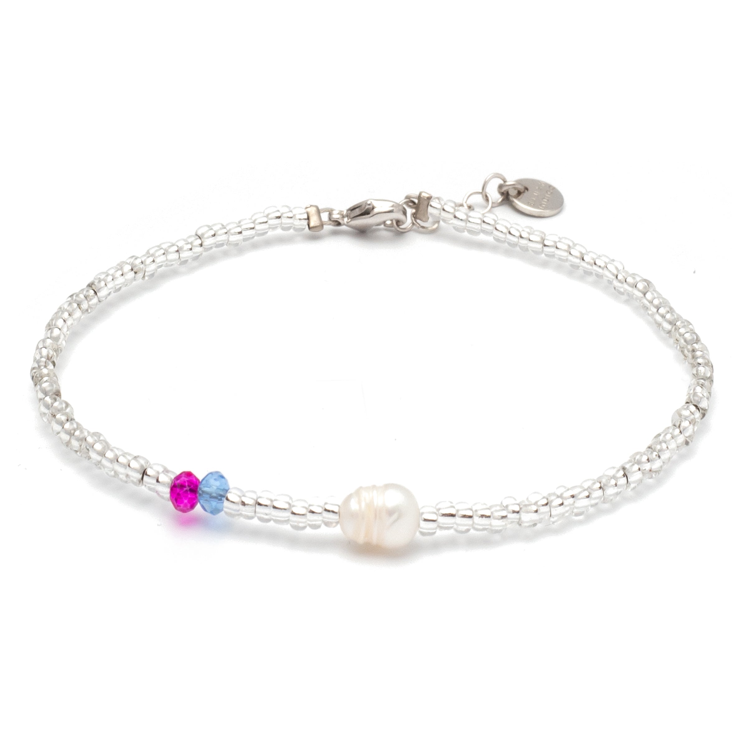 The bracelet Java is a symphony of tranquility in our colorful Bali Beach collection. Silver beads line up elegantly around your wrist. A freshwater pearl and two crystal beads in pink and light blue add subtle splashes of color.