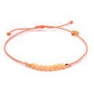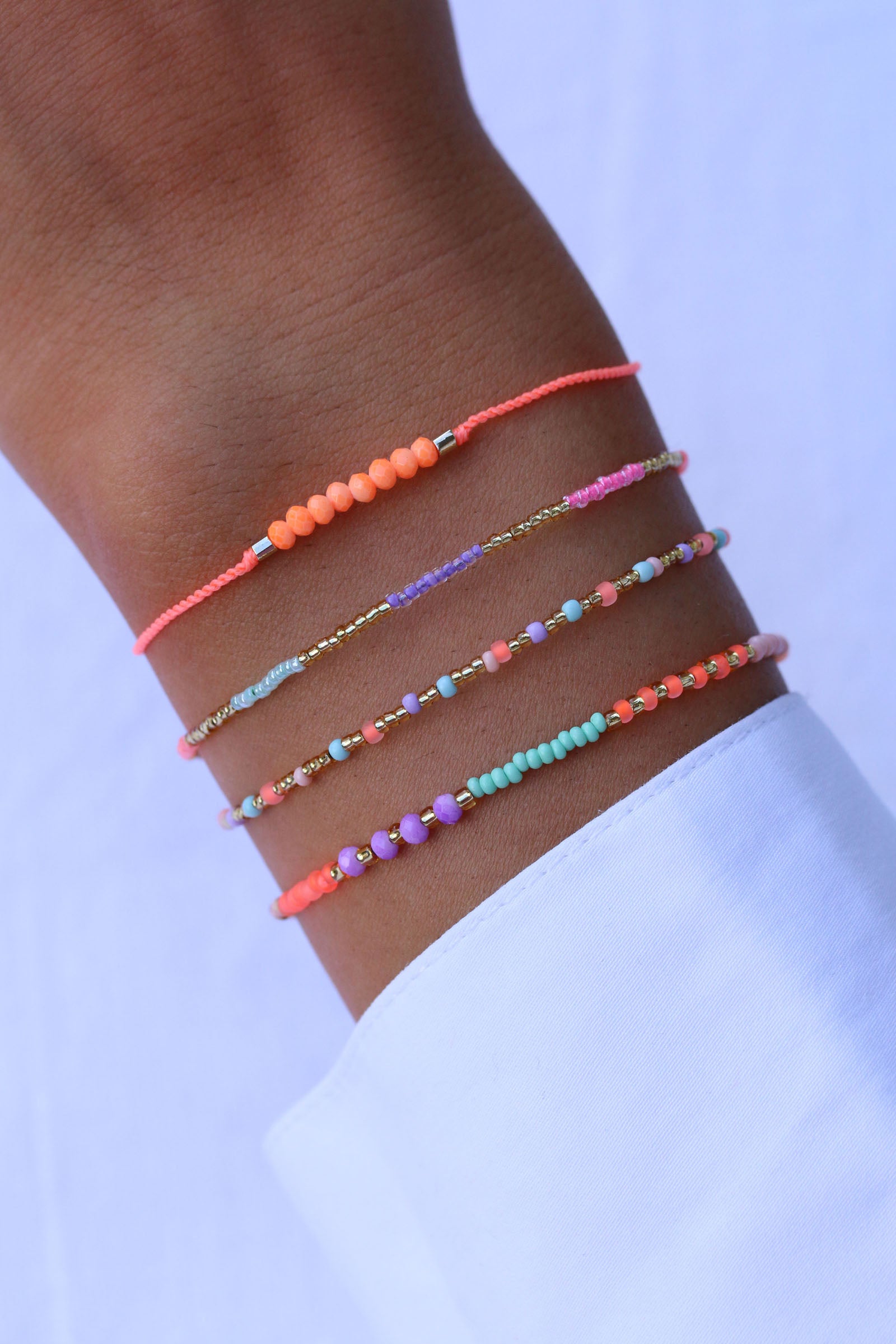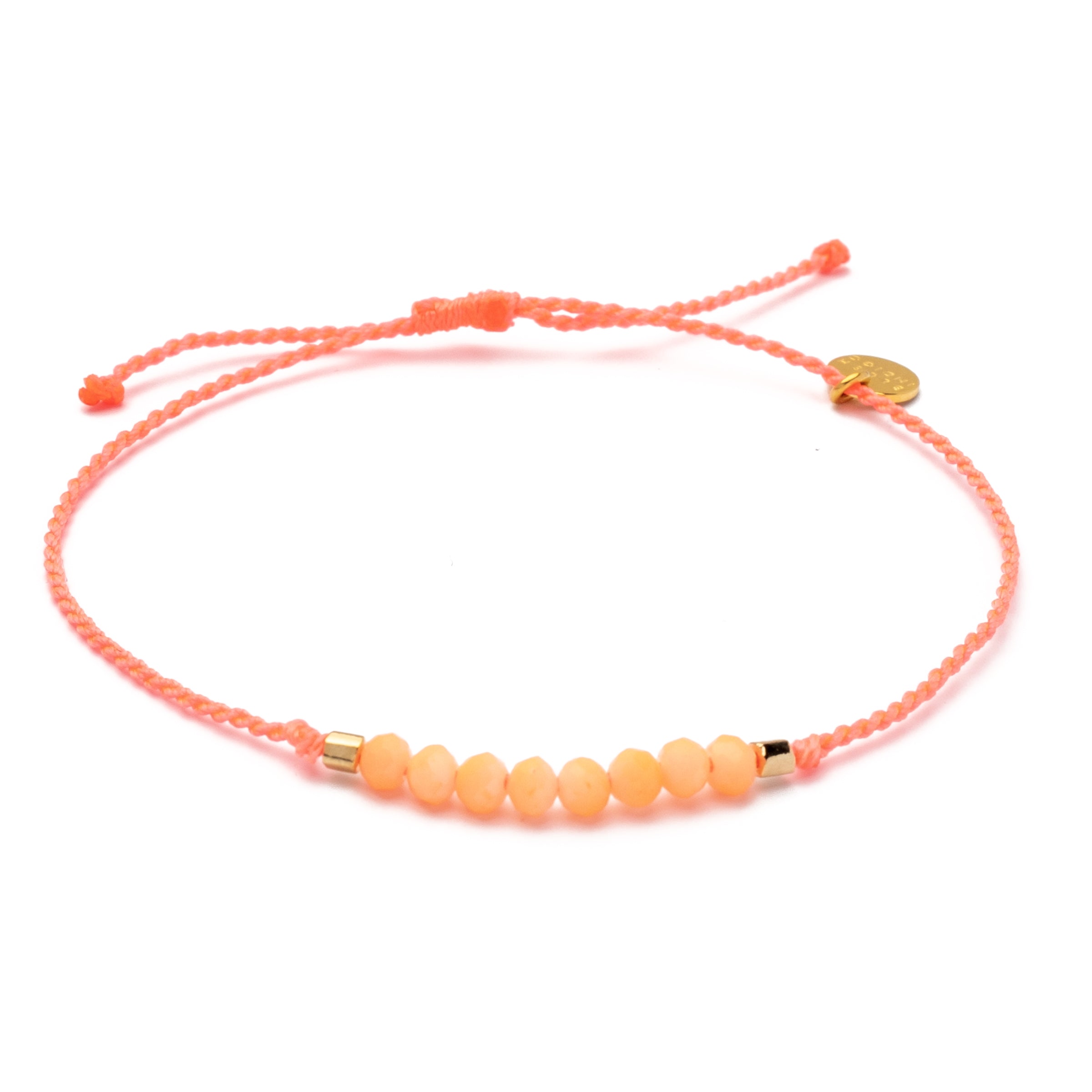 Eight faceted crystal beads in matt coral are the spotlight of the neon coral nylon bracelet. The elegant mix of colors is framed by two gold beads. Your wrist can hardly be decorated more discreetly.