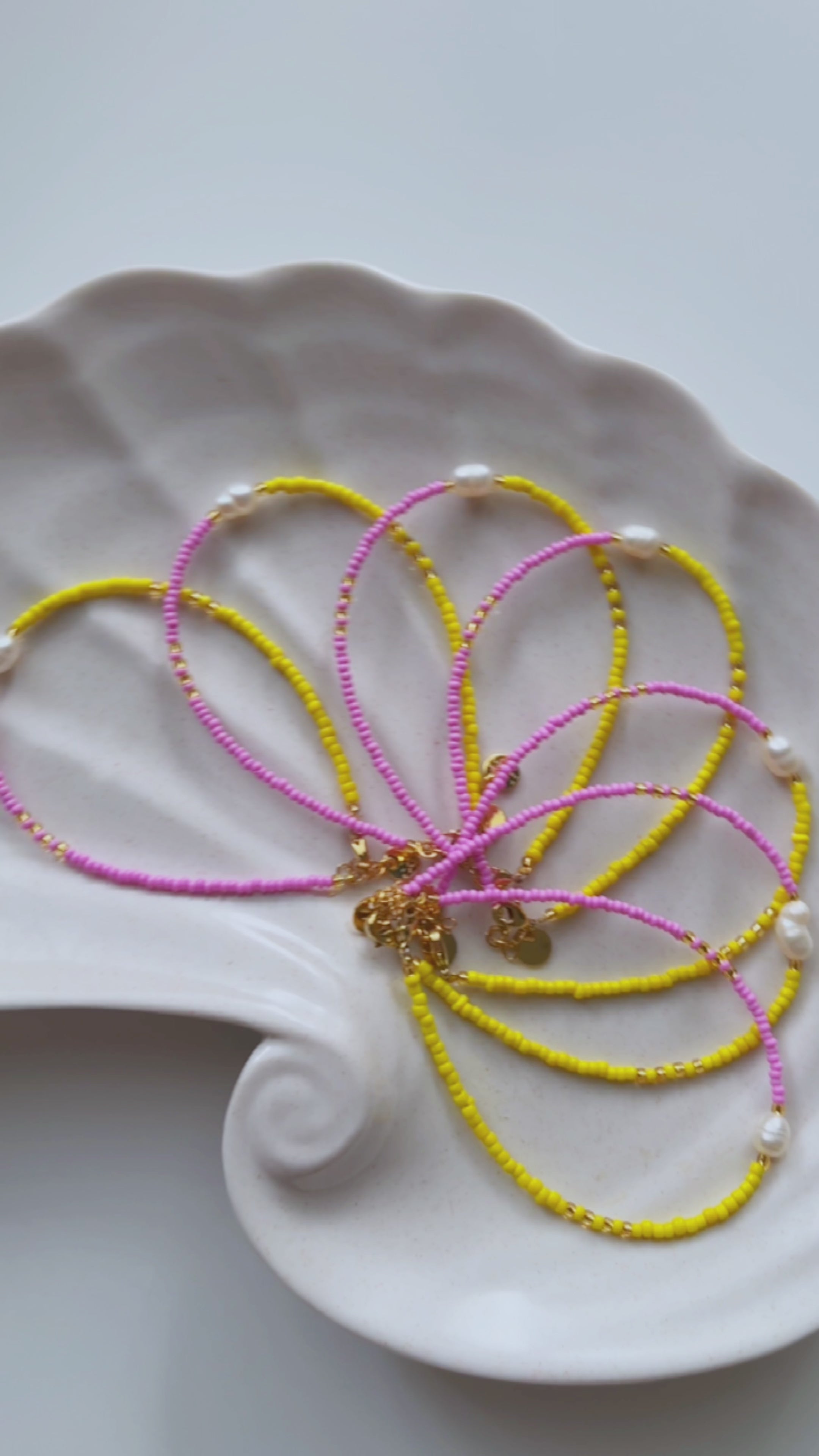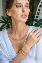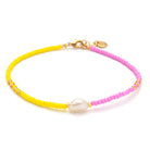 The Bora Bora bracelet from our Isola series is a two-tone pastel mix in a timeless design: one half of the bracelet is made of matte yellow beads, the other half is made of matte light pink beads. A freshwater pearl is the radiant focal point, framed by scattered gold beads.