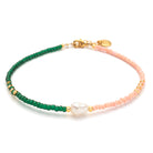 The Paros bracelet from our Isola series is a two-tone pastel mix in a timeless design: one half of the bracelet is made of matte turquoise beads, the other half is made of matte white beads. A freshwater pearl is the radiant focal point, framed by scattered gold beads.
