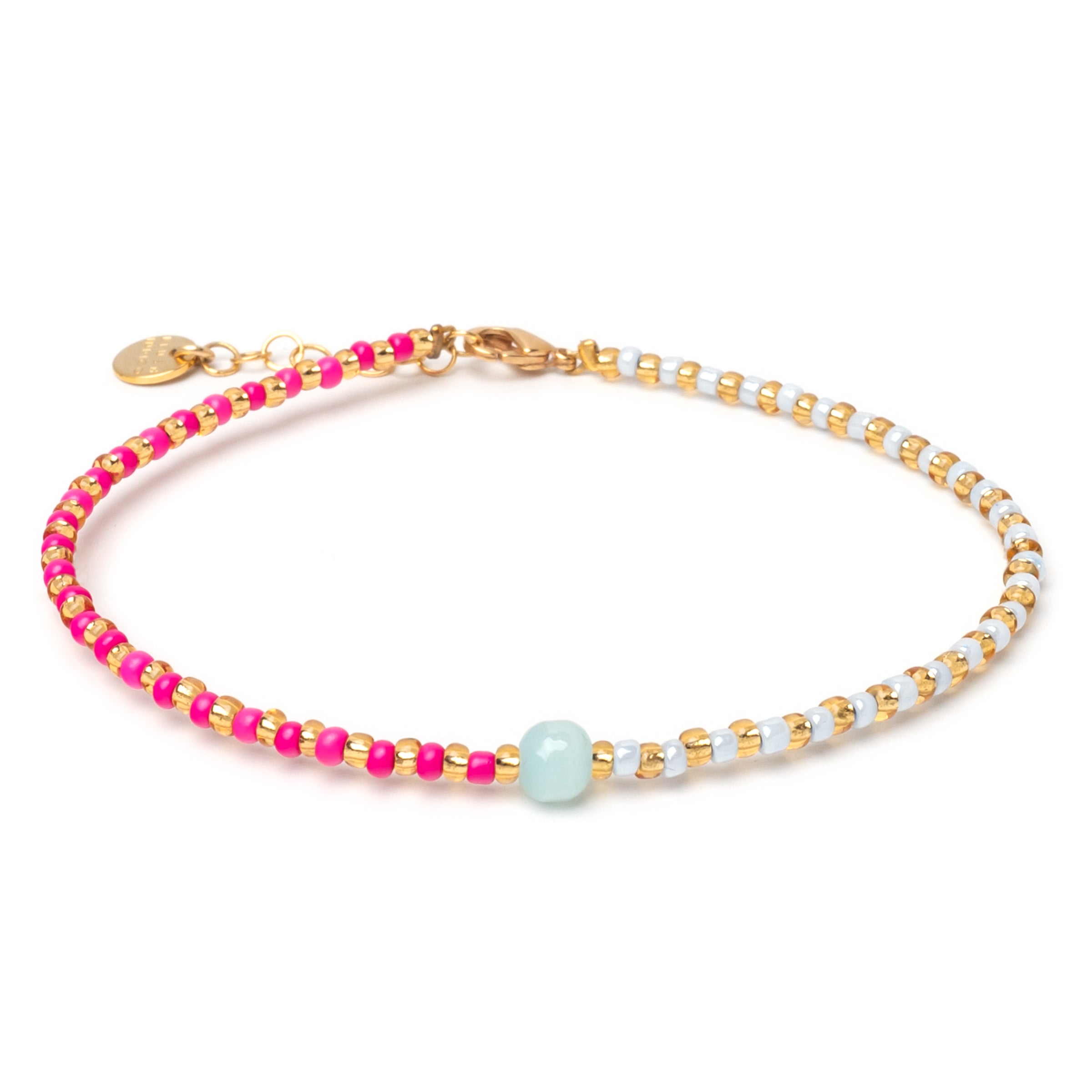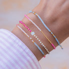 Sky blue and neon pink set the tone in the Pink Sky mix set. It reminds us of a bright blue sky with pink fleecy clouds, garnished with threefreshwater pearls for a nautical vacation feel.