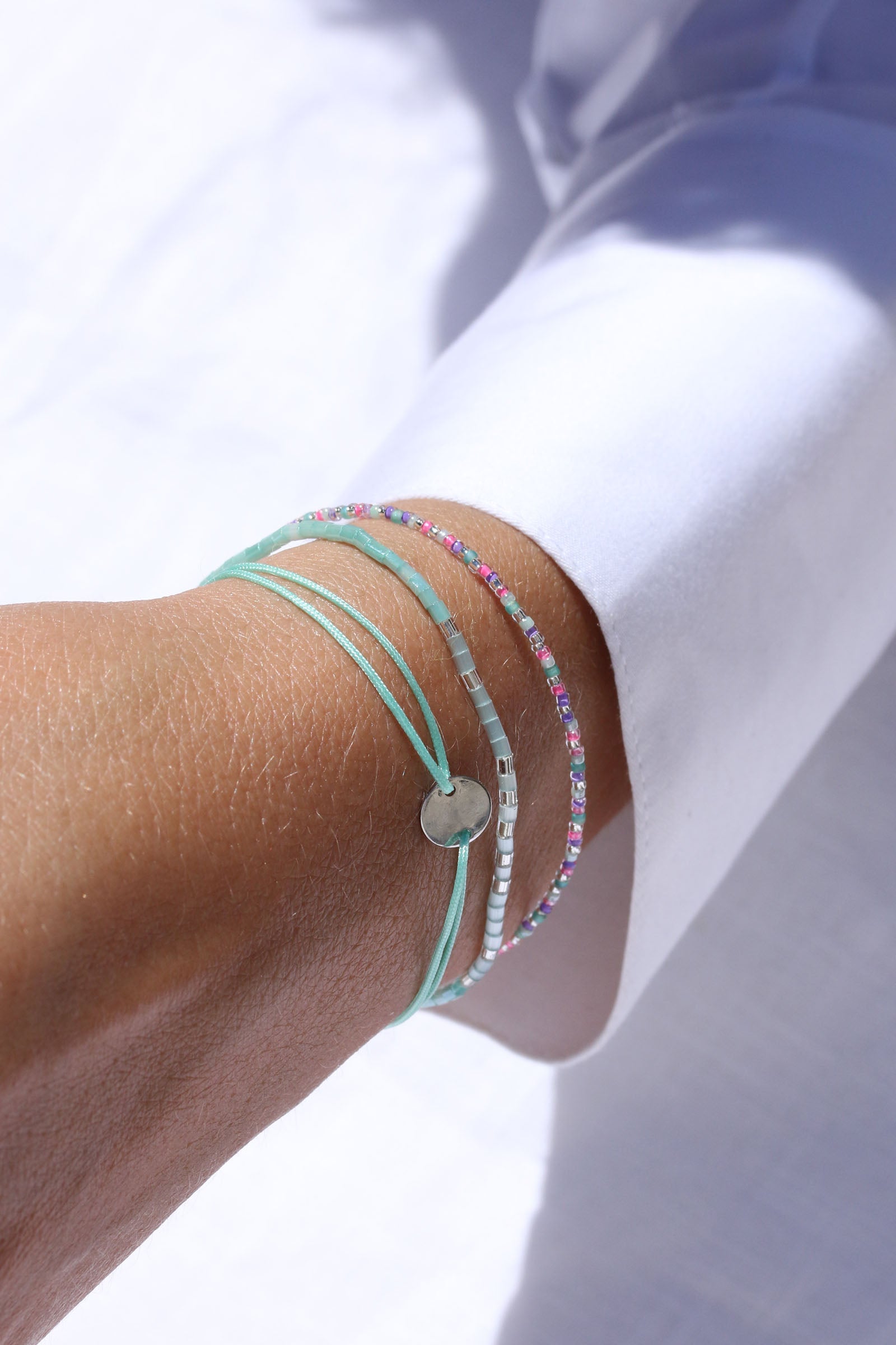 This pretty addition to our Frosted Collection is made of mint green beads that shimmer majestically in the sunshine. For more monochrome bracelets have a look at our Frosted Collection. They are particularly suitable for combining with other wrist candy.