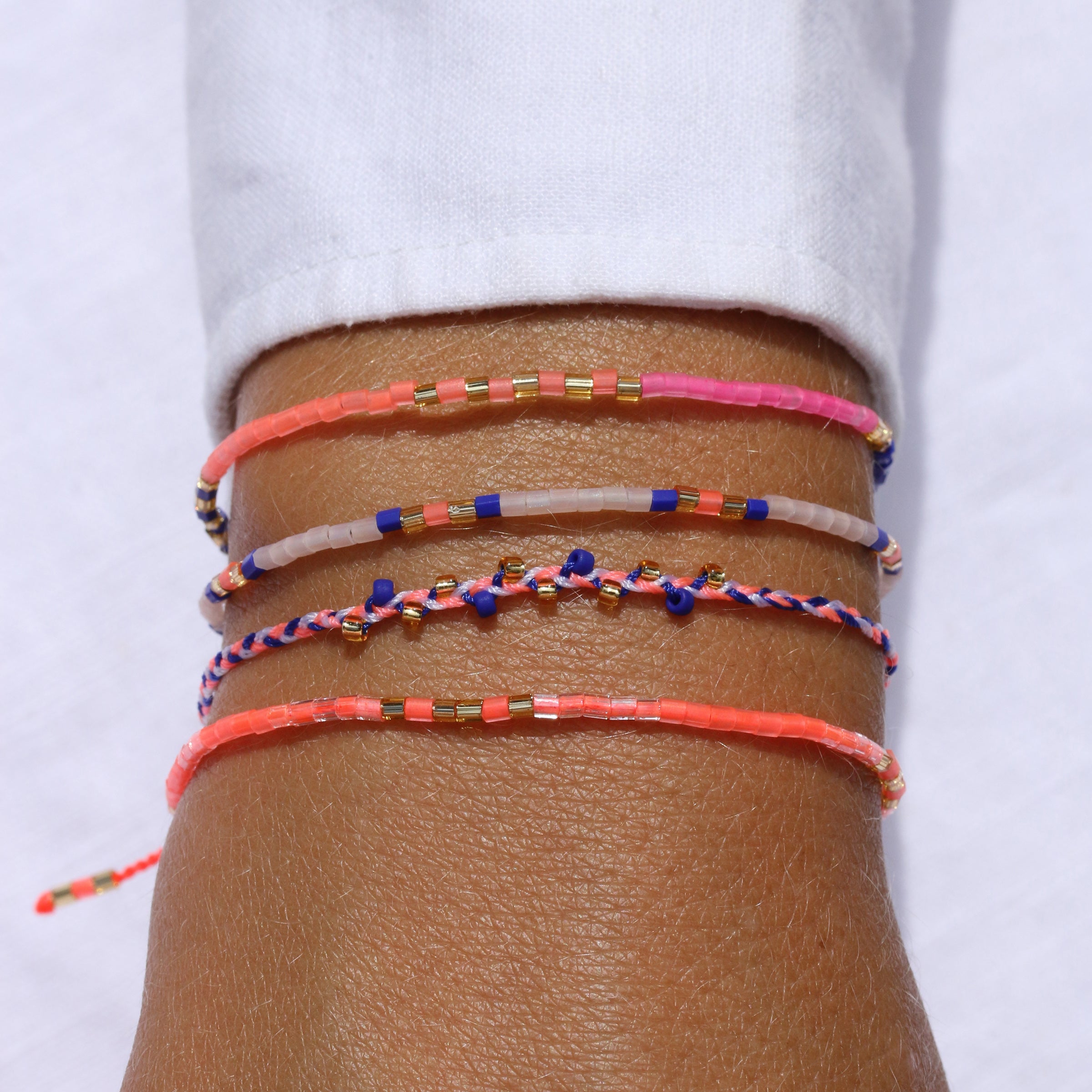 We used yarn in Neon Coral, Indigo Blue und White to braid it into a colorful bracelet. Twelve beads in Glossy Coral and Gold add to the dainty charm of our Take a Twist Bracelet.