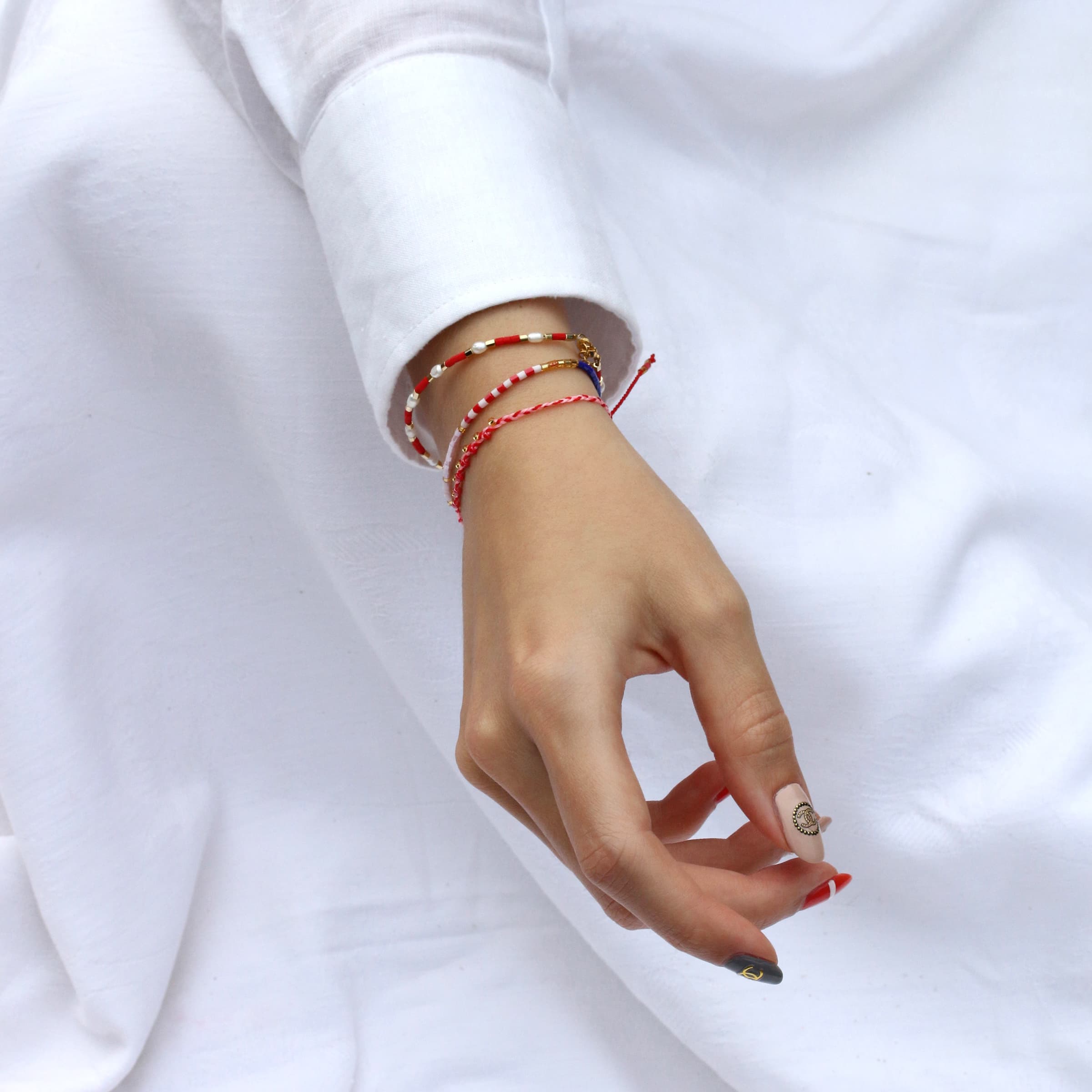 We used yarn in Red and Blush Rose to braid it into a colorful bracelet. Twelve beads in Red and Gold add to the dainty charm of our Take a Twist Bracelet.