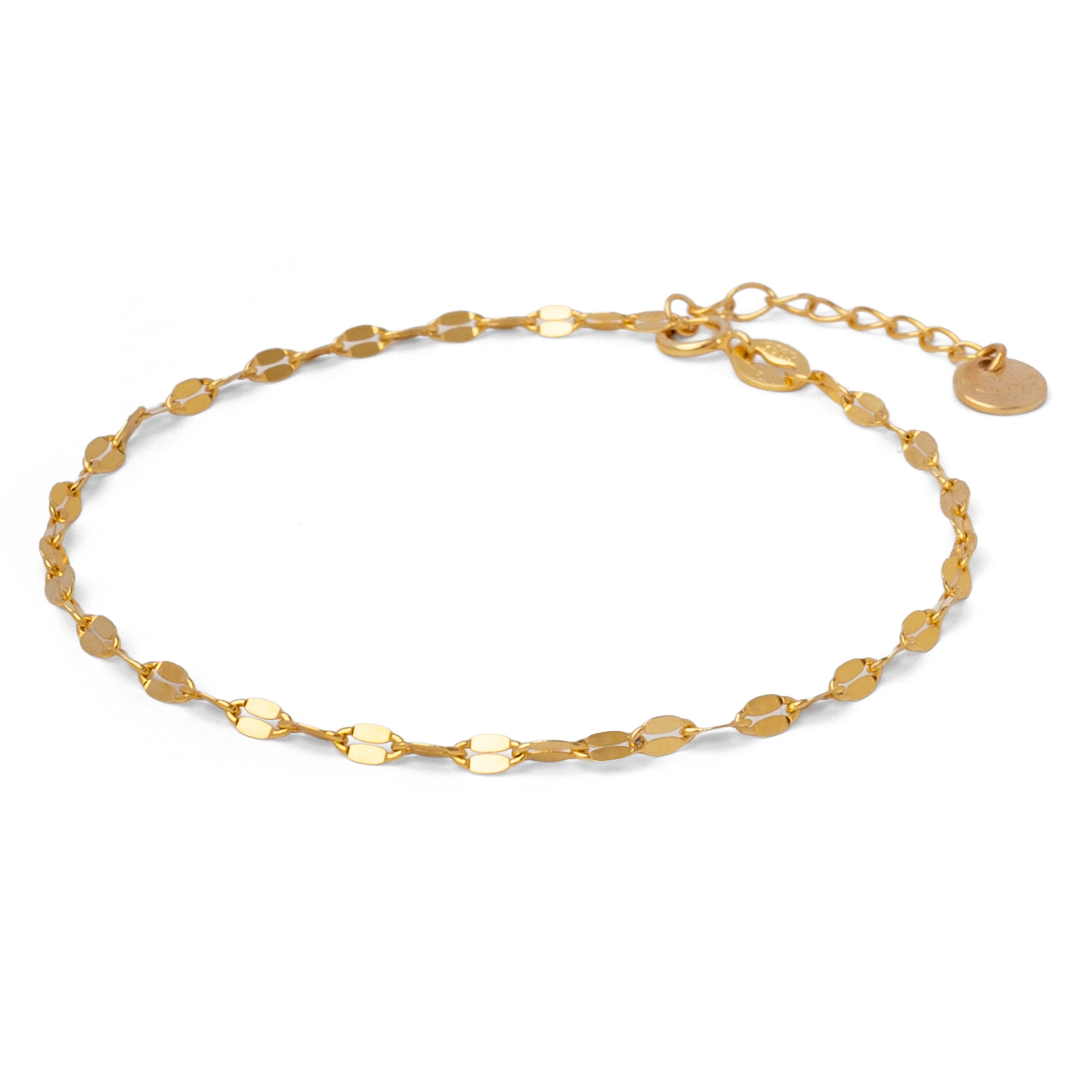 The bracelet is 17 cm long and can be extended by 2 cm. It is 925 silver with 18k gold plating.The gold plating is very high quality so you will enjoy the anklet for a long time.