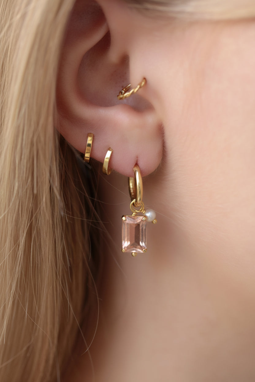 The centerpiece of our hammered hoop earrings is a rectangular morganite that moves freely on the hoop. A small freshwater pearl adds the perfect finishing touch.