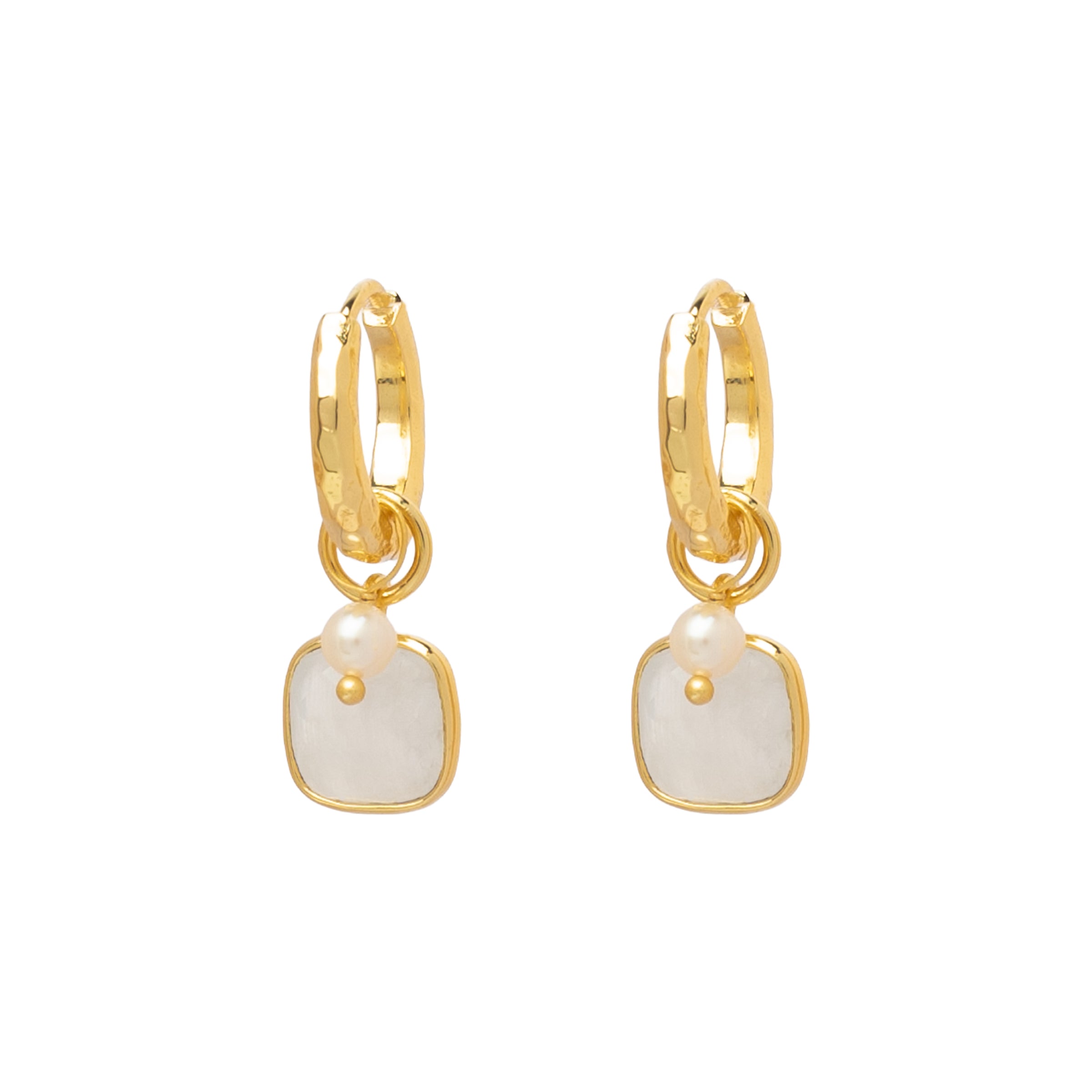 The solid Elpis hoop earrings, crafted from gold-plated brass, captivate with their hammered 18-karat gold finish, which shimmers subtly and lends the design an elegant lightness. A square, shimmering white moonstone and a 3 mm freshwater pearl take center stage, moving freely within the hoop.