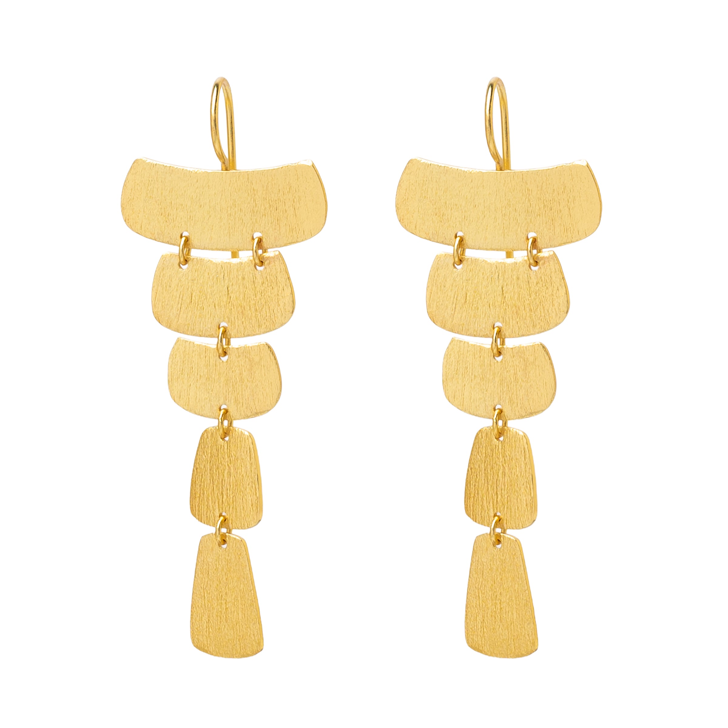 Our Ananya gold drop earrings are a striking statement piece with modern elegance. Five irregularly shaped, rectangular coin pendants are harmoniously arranged, their distinctive brushed surface lending the design a special depth. The interplay of light and texture underscores the handcrafted, organic look of the earrings.