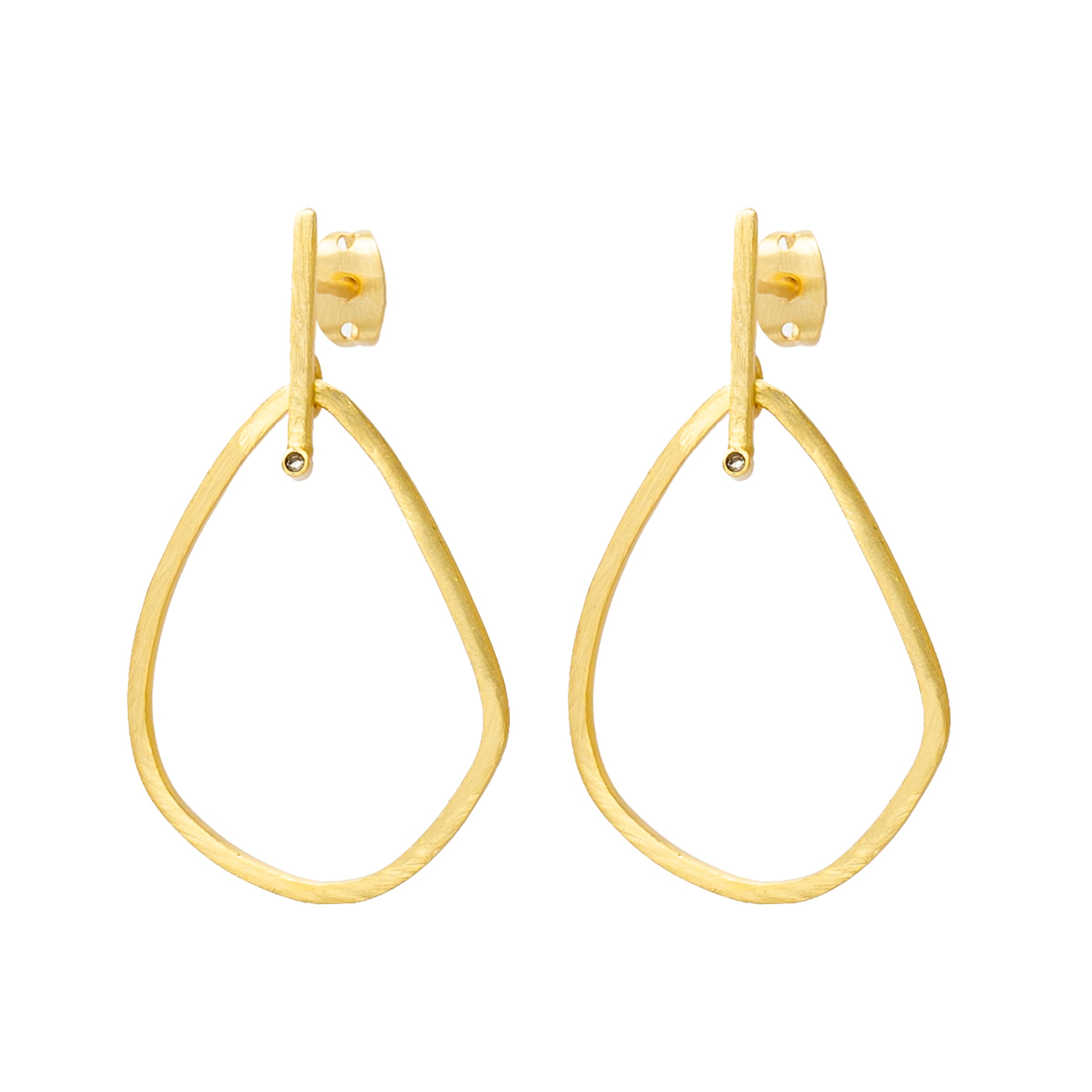The Obelisk earrings, crafted from 18k gold-plated brass, combine clean lines with vibrant movement. A teardrop-shaped pendant can move freely on the delicate bar stud earring.