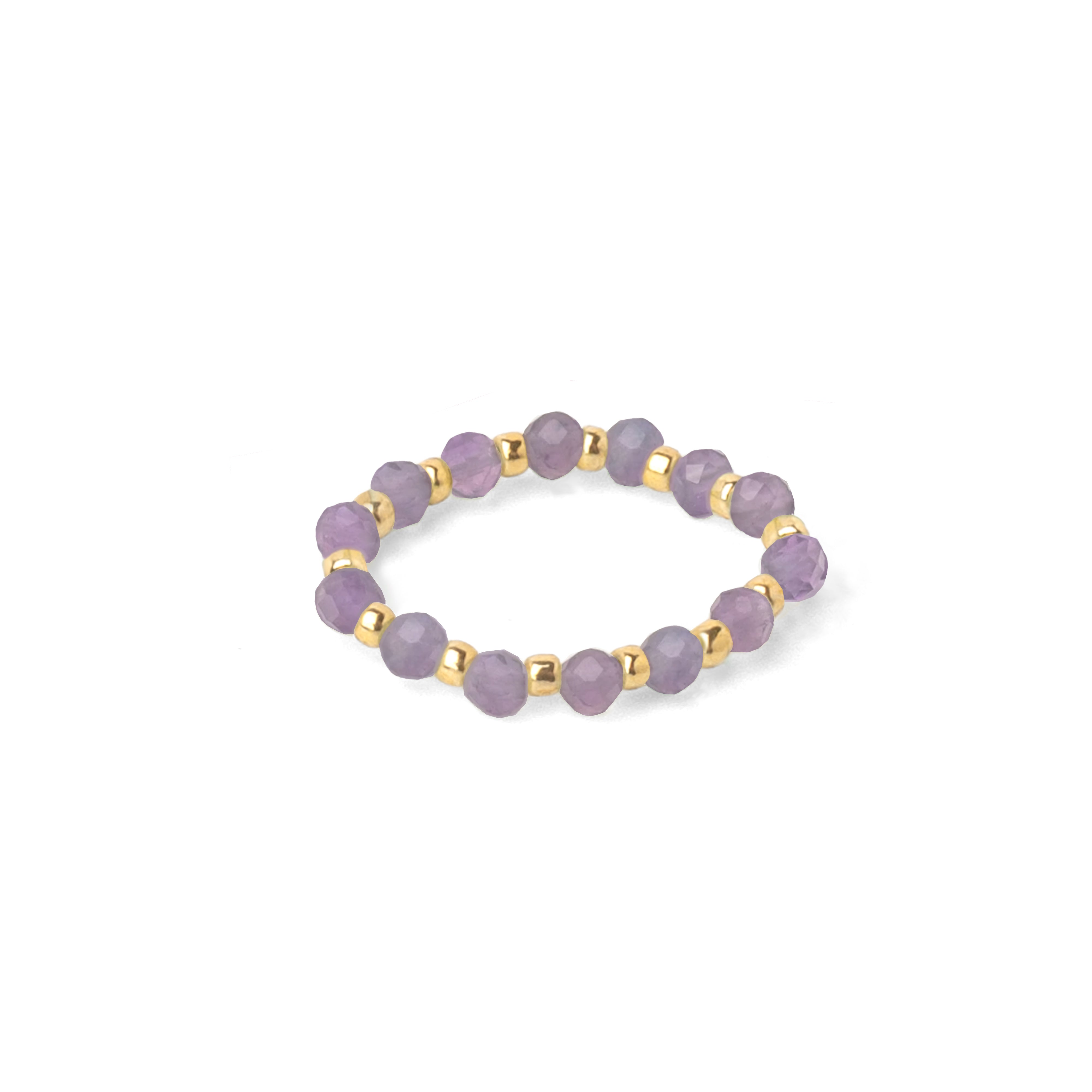 Delicate, faceted 2 mm aventurine stones shimmer in a soft light green on the finger, alternating elegantly with golden metal beads. The elastic band ensures that the ring flexibly fits sizes 56–58 and sits comfortably.