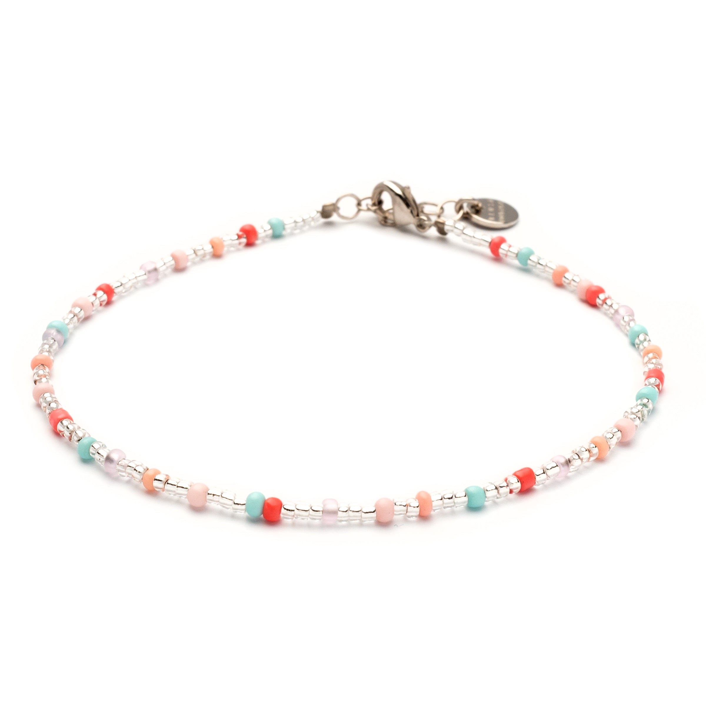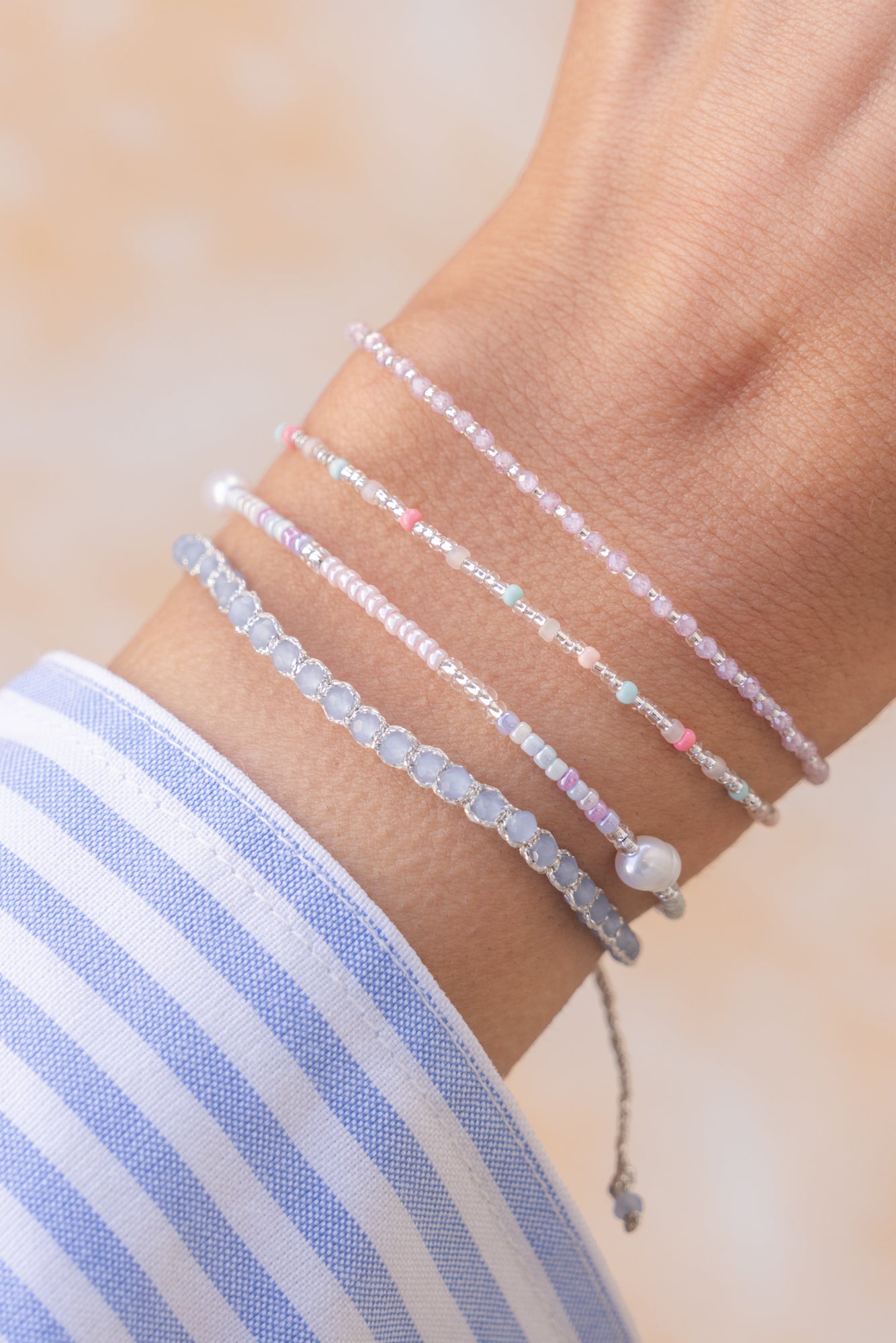 Die Farben unseres Be-Blush-Bändchens Ithaka strahlen in soften Sorbet-Tönen um die Wette. Matte Roccailles Perlen in Coral, Hellblau und Blush Rose sind wild gemixt, silberne Perlen verleihen eine elegante (Best)note.