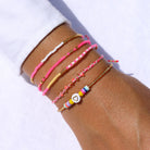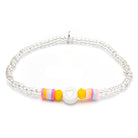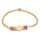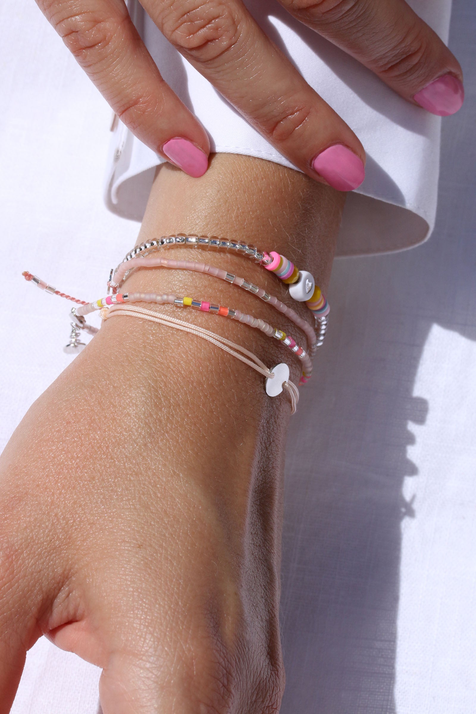 Das Bändchen aus unserer Candy-Serie ist nicht nur zum Anknabbern süß, die Perle mit ♥-Symbol ist auch eine zuckersüße Liebeserklärung. Eingerahmt ist das Herz von farbenfrohen Kristallperlen und bunten Heishi Pearls aus Gummi. Alle Perlen sind zufällig gewählt und farblich unterschiedlich. Dadurch gleicht kein Armband dem anderen.