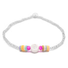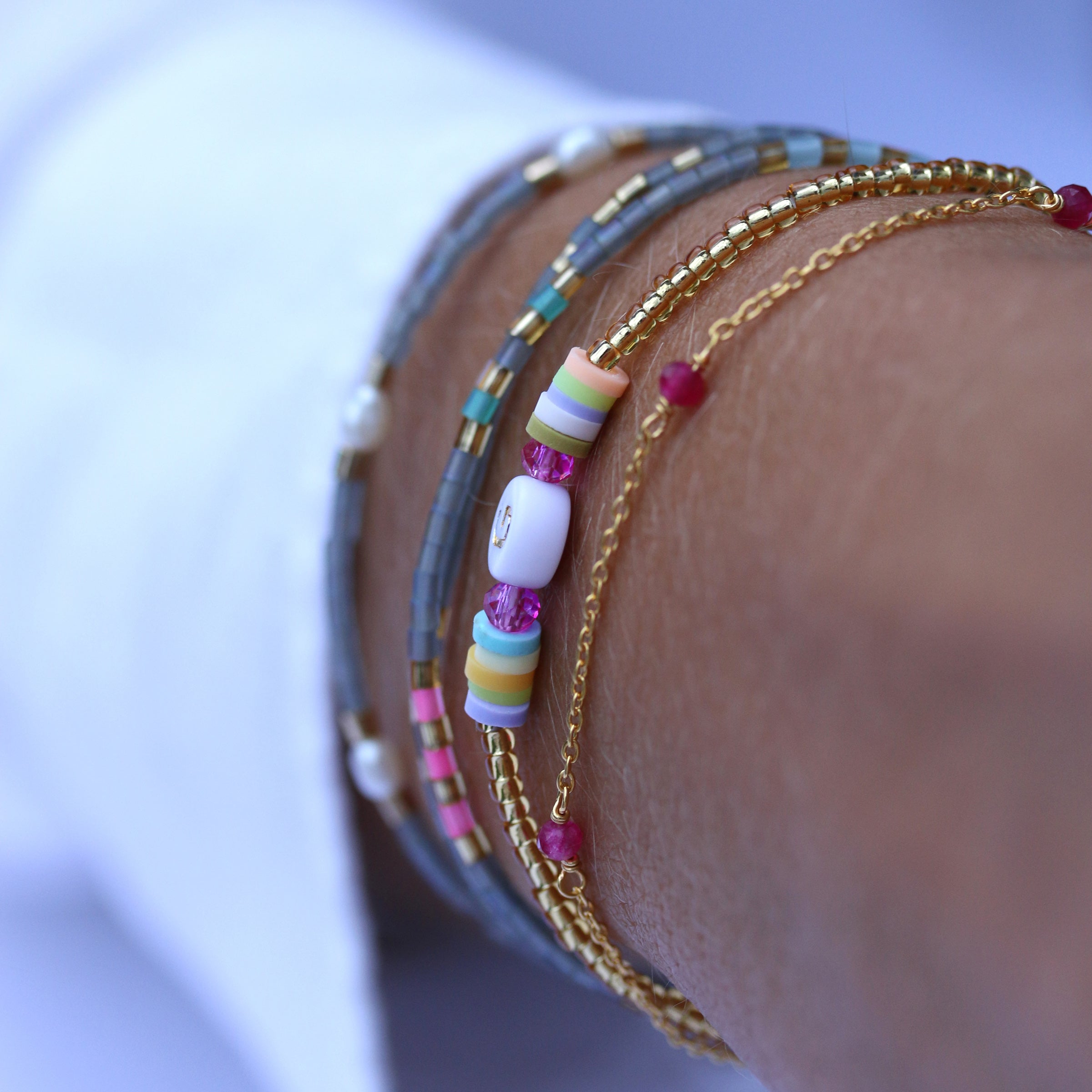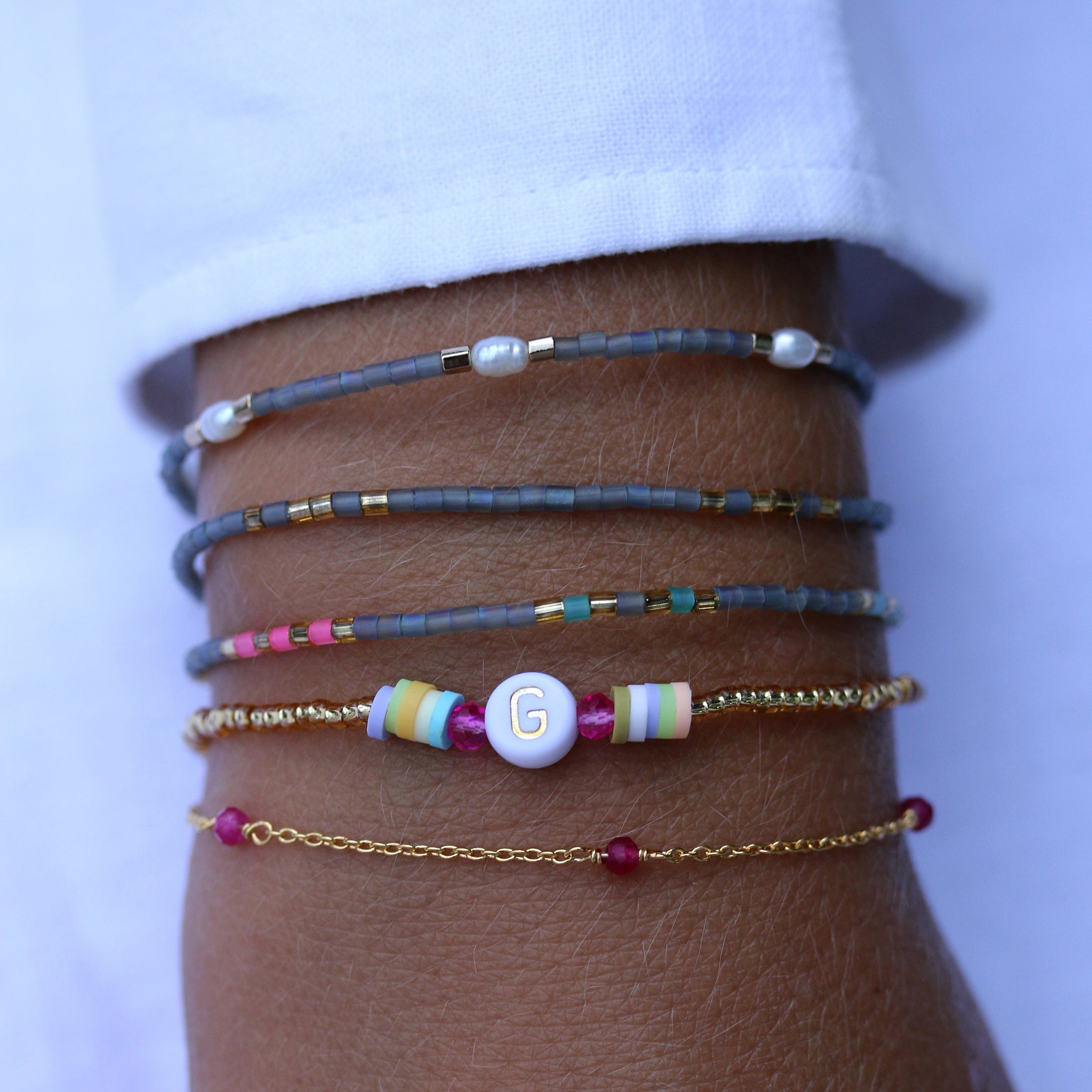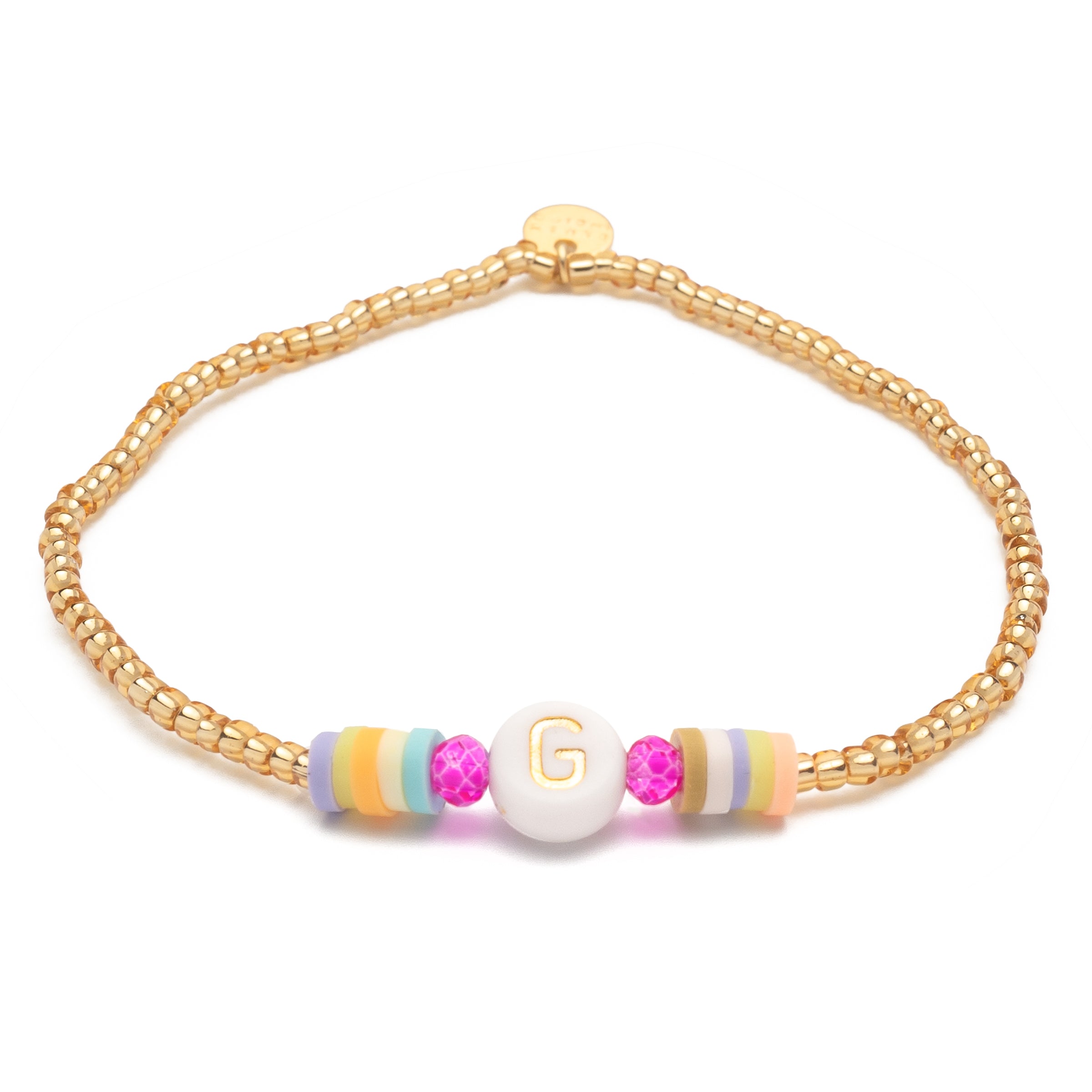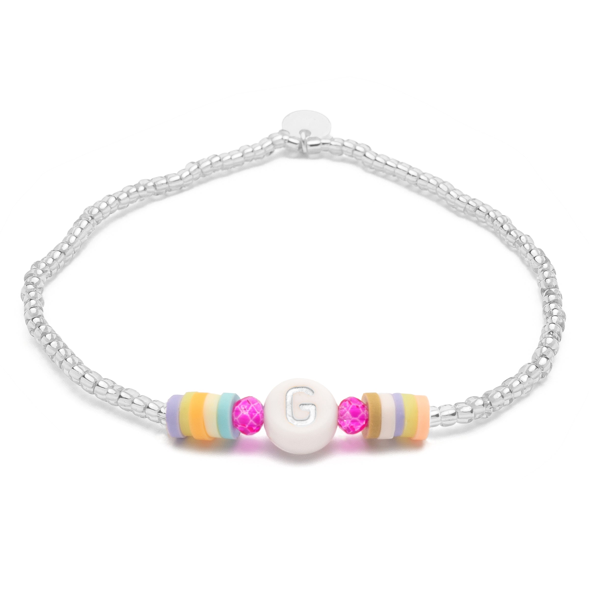 Für all die Gretas, Gabriellas und Gerdas ... Das Bändchen aus unserer Candy-Serie ist nicht nur zum Anknabbern süß, die weiße Perle feiert auch deine Einzigartigkeit oder die eines geliebten Menschen. Eingerahmt ist der Buchstabe von farbenfrohen Kristallperlen und bunten Heishi Pearls aus Gummi.