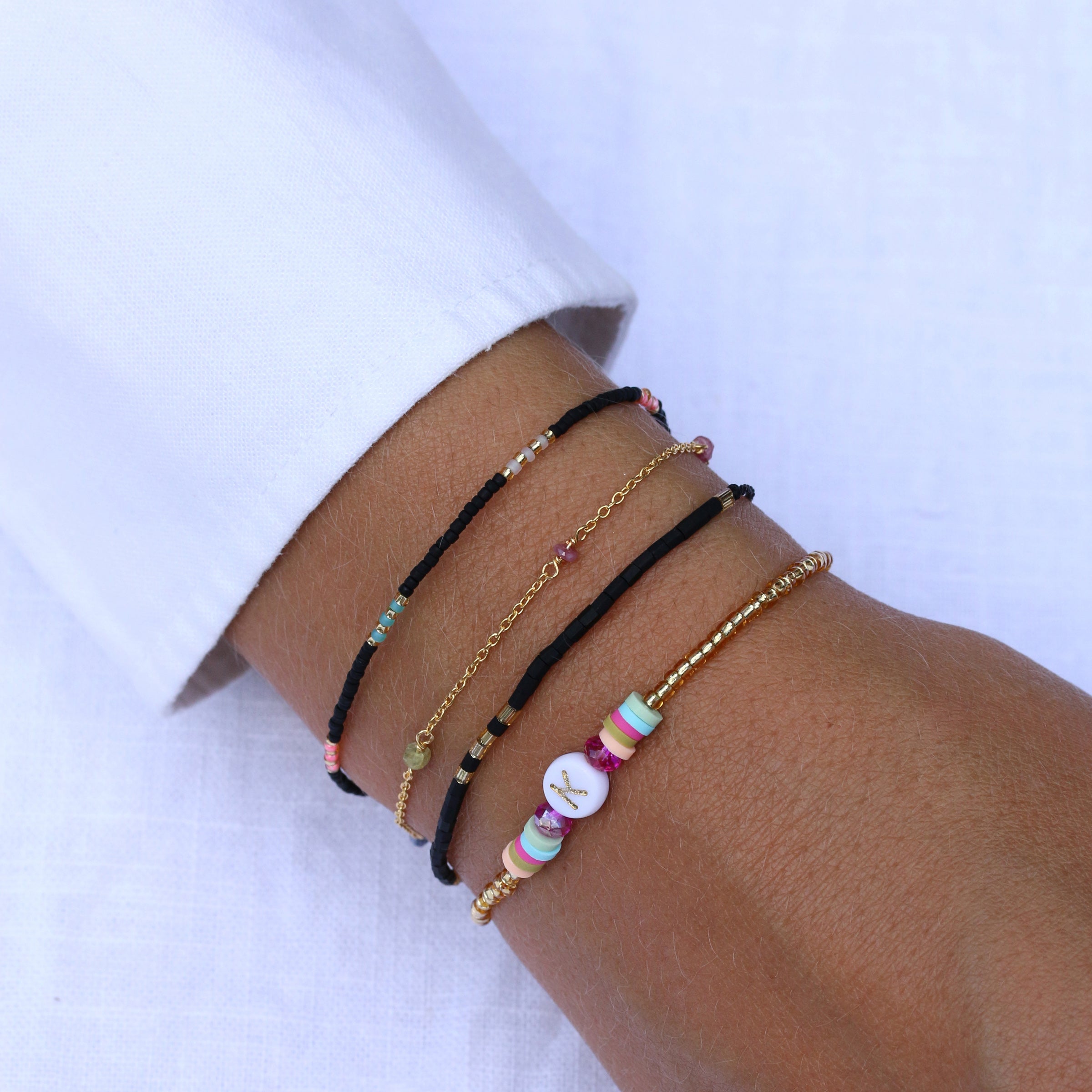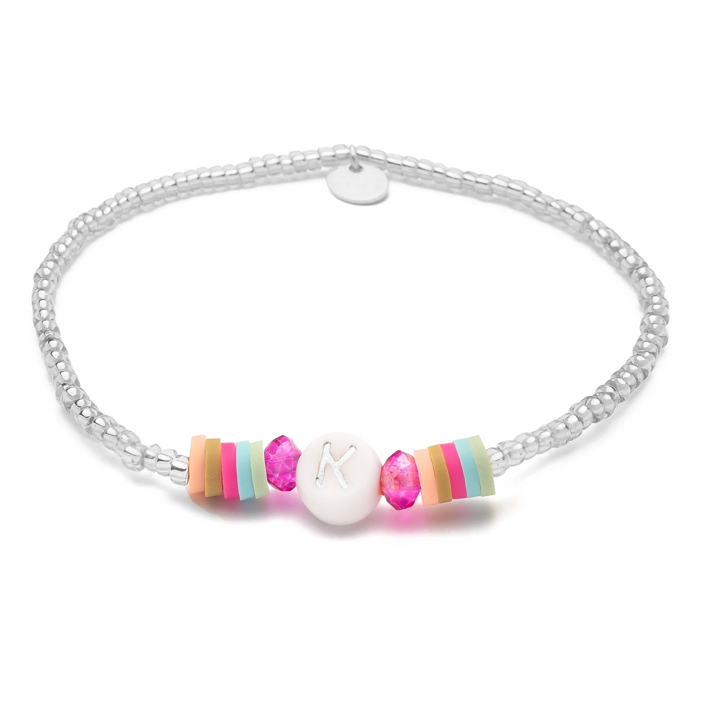 Für all die Katrins, Kims und Katarinas ... Das Bändchen aus unserer Candy-Serie ist nicht nur zum Anknabbern süß, die weiße Perle feiert auch deine Einzigartigkeit oder die eines geliebten Menschen. Eingerahmt ist der Buchstabe von farbenfrohen Kristallperlen und bunten Heishi Pearls aus Gummi.