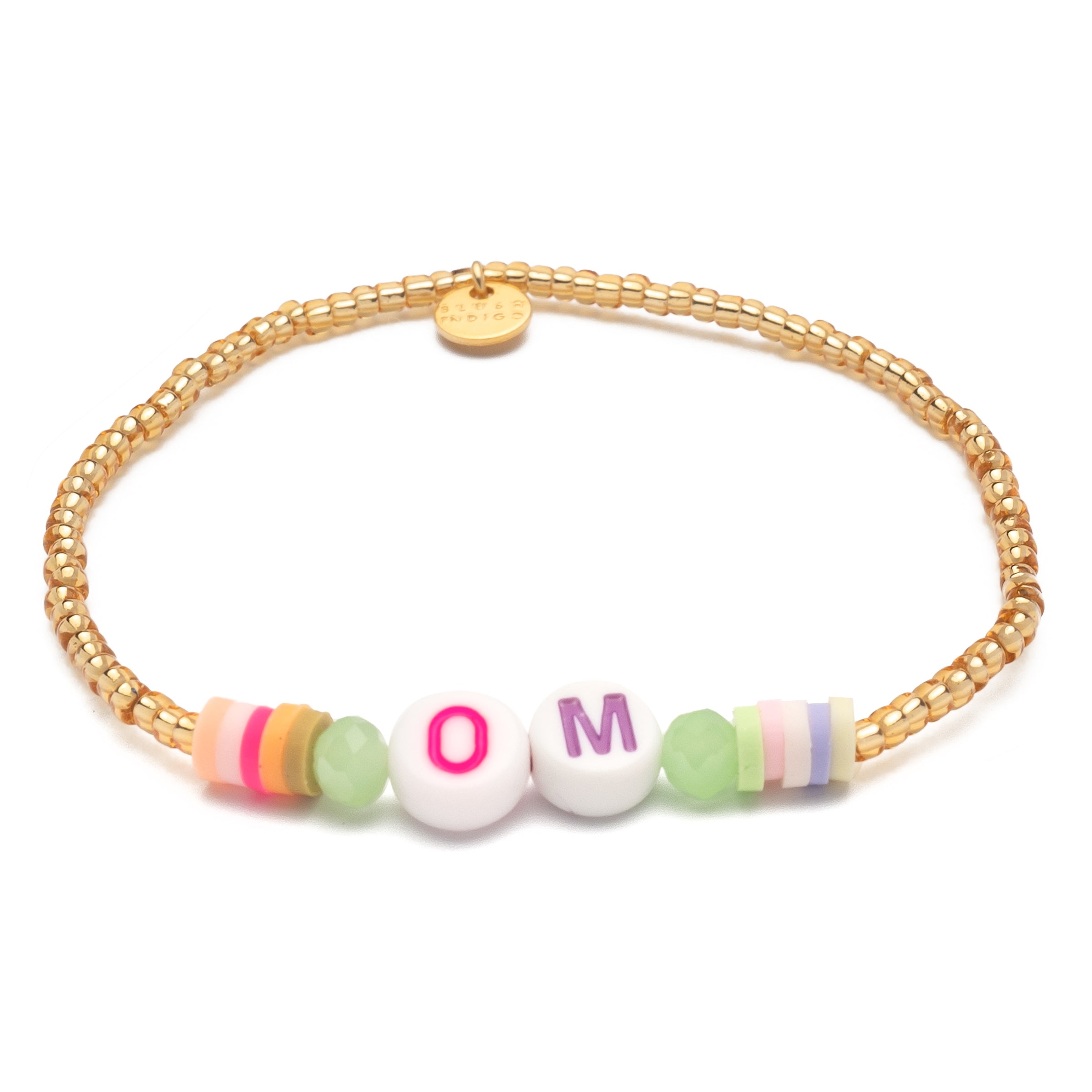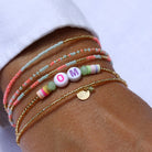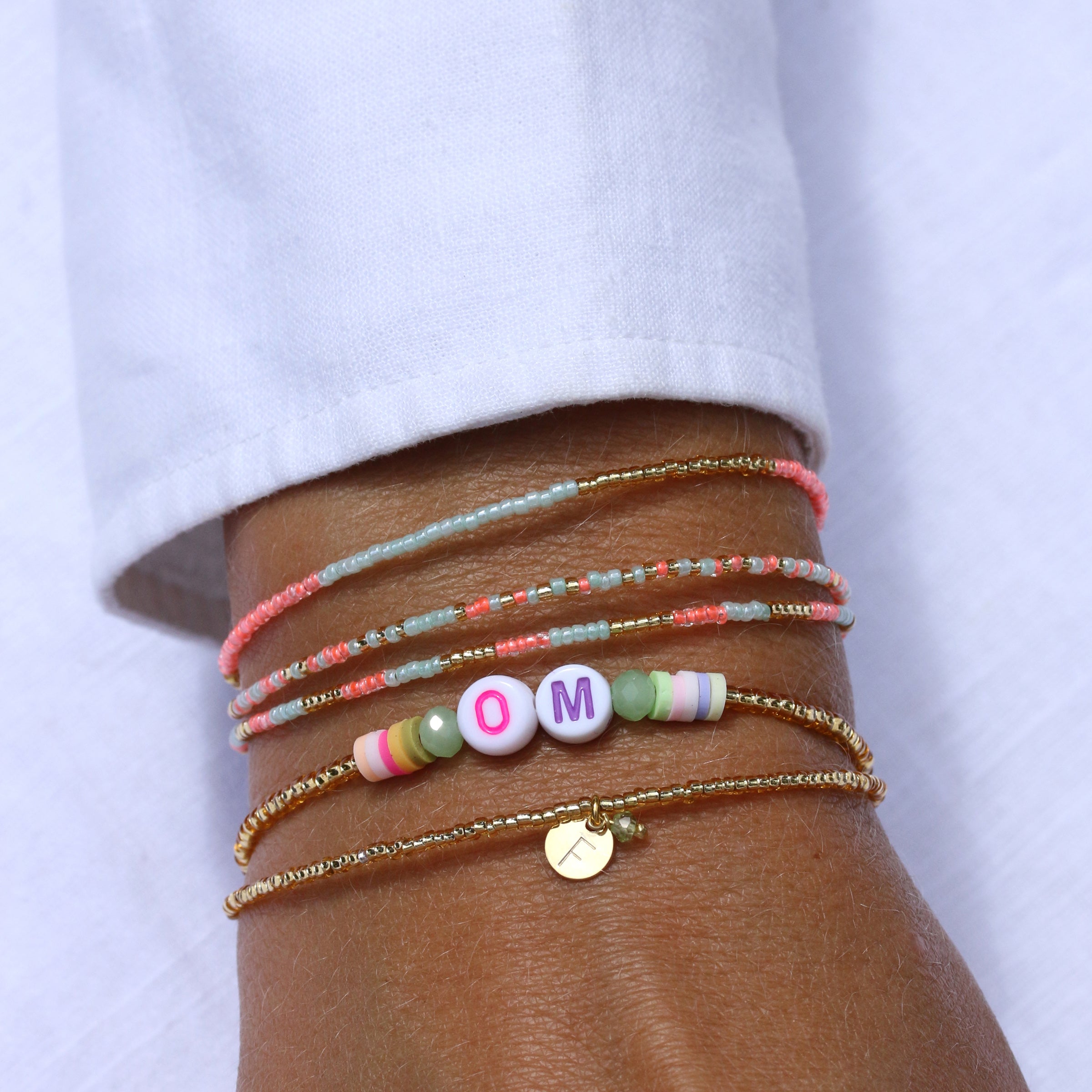 Die weißen Buchstaben-Perlen sind eingerahmt von farbenfrohen Kristallperlen und bunten Heishi Pearls aus Gummi. Alle Perlen sind zufällig gewählt und von unterschiedlicher Farbe. Dadurch gleicht kein Armband dem anderen.