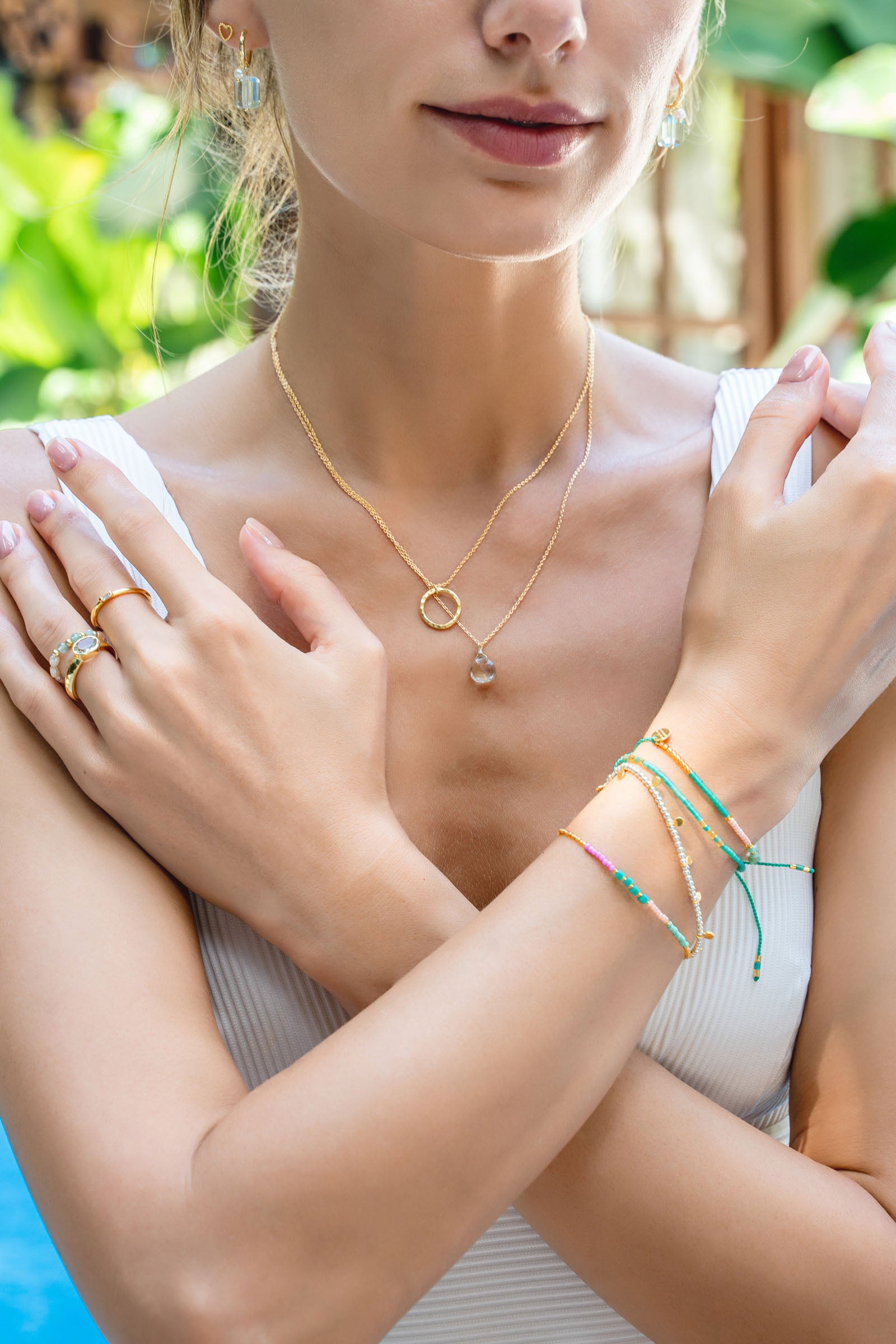 Unser Schmuck ist hochwertig vergoldeter bzw. versilberter Mode- oder Silberschmuck. Die verwendeten Metallteile stammen aus Deutschland und Italien und werden nach Bali importiert. Unsere Goldauflage bei den Karabinern, dem Logo-Plättchen und der Verlängerungskette besteht aus 24 Karat Gold. Dennoch handelt es sich um eine Schicht, die sich je nach Trageverhalten abnutzen kann.