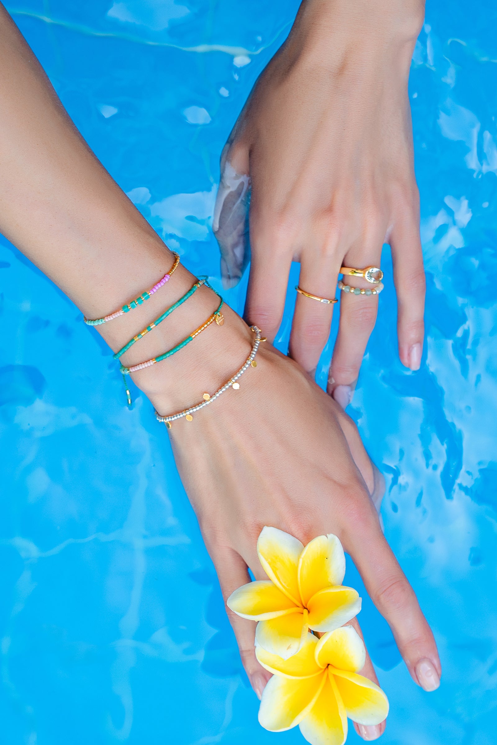 Das Armband Corinth ist elastisch und kann einfach über das Handgelenk gezogen werden. Die insgesamt 13 Coin-Anhänger haben einen Durchmesser von 2 mm.