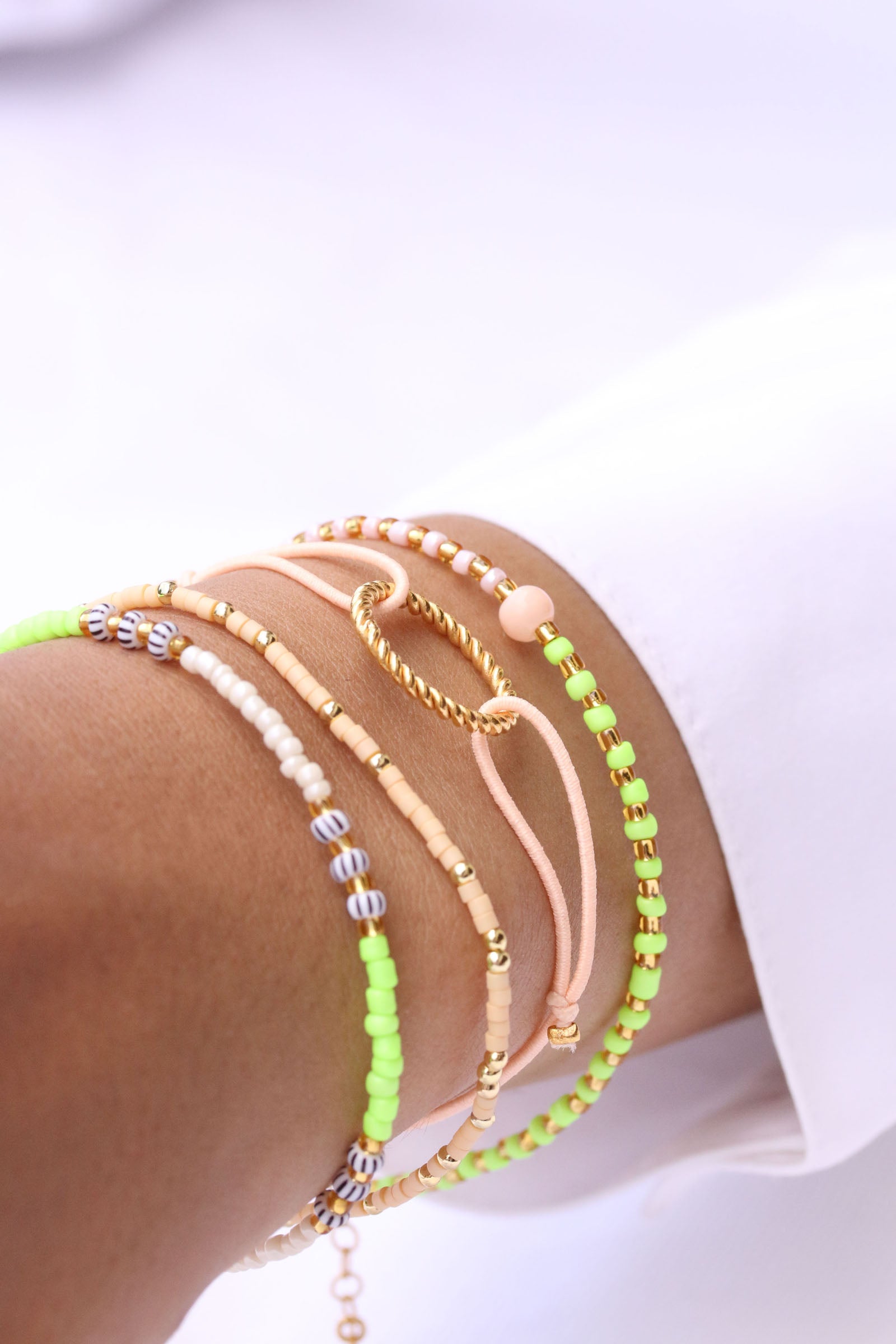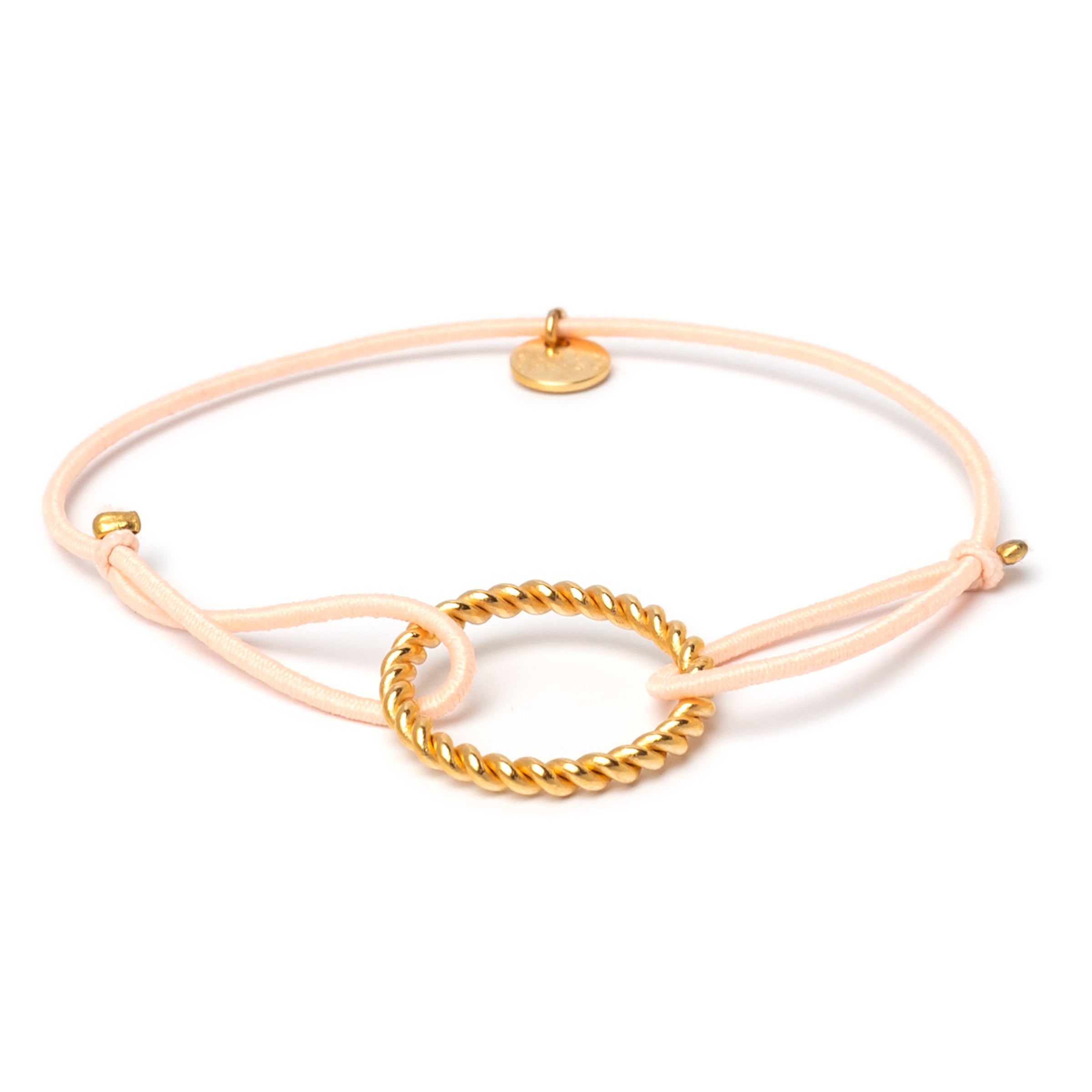 Das Armband Darling Circle hat das Zeug zum Lieblingsstück in deinem Schmuckkästchen. Das elastische Nylon-Band in Beige schmiegt sich elegant an dein Handgelenk. Strahlender Mittelpunkt ist der gedrehte kreisförmige Circle-Anhänger aus 24k vergoldetem Edelstahl.